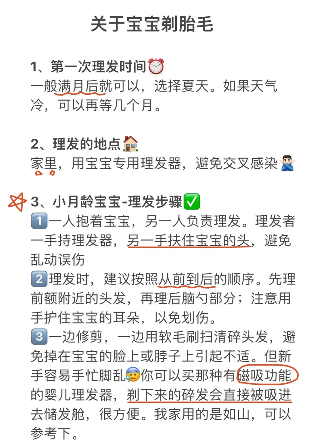 ▪️不要剃光是共识,但至于什么时候剃,网上就说法不一,说满月、3个月、6个月的都有,而从我自身的带娃经验看,满月后其实就可以的✔️,满月后随便哪一天,就看家长的心情和喜好决定。只要理发过程中,注意好分寸,不要🙅🏻♂️剃光,保证没有伤害到宝宝的头皮毛囊就行。