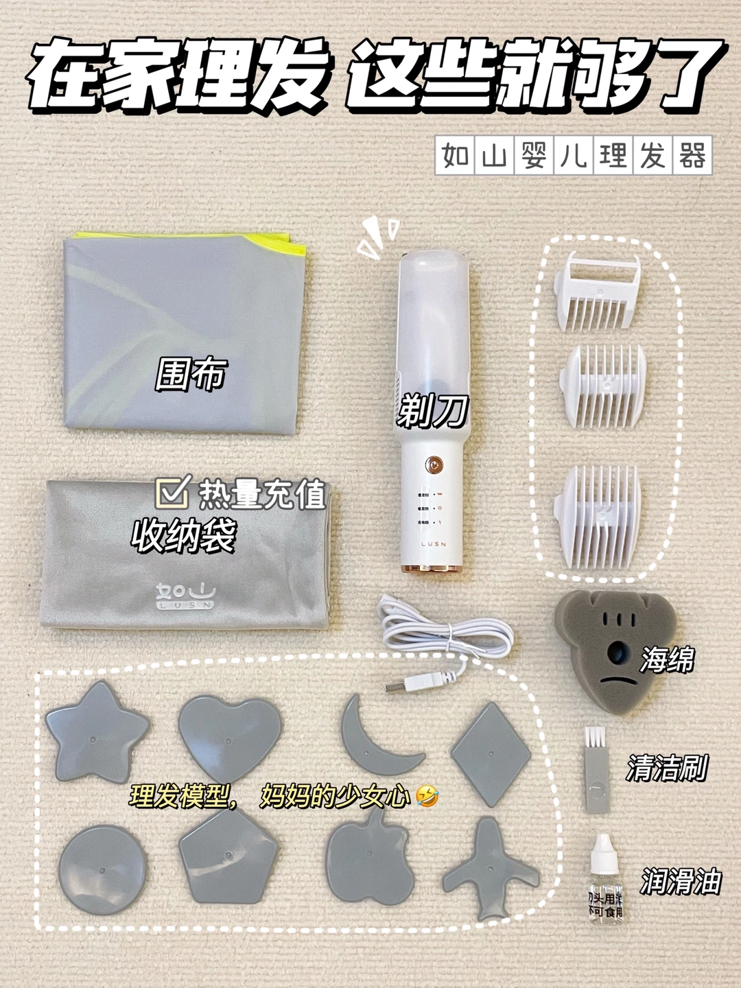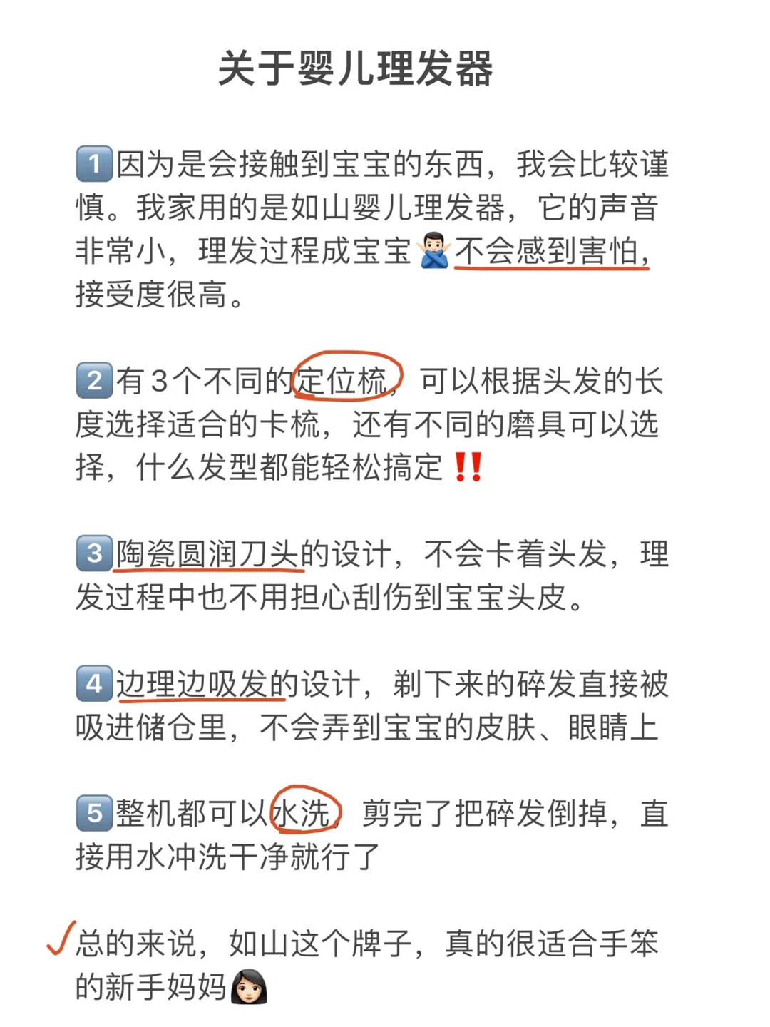 1,因为是会接触到宝宝的东西,我会比较谨慎。我家用的是如山婴儿理发器,它的声音非常小,理发过程成宝宝不会感到害怕,接受度很高。