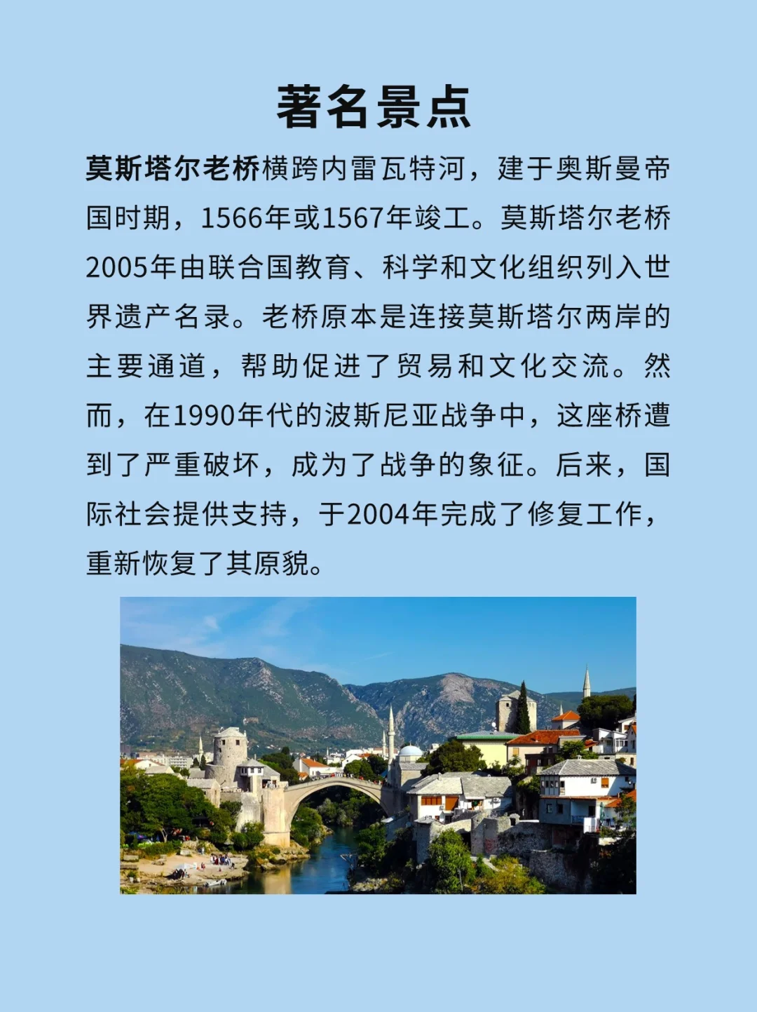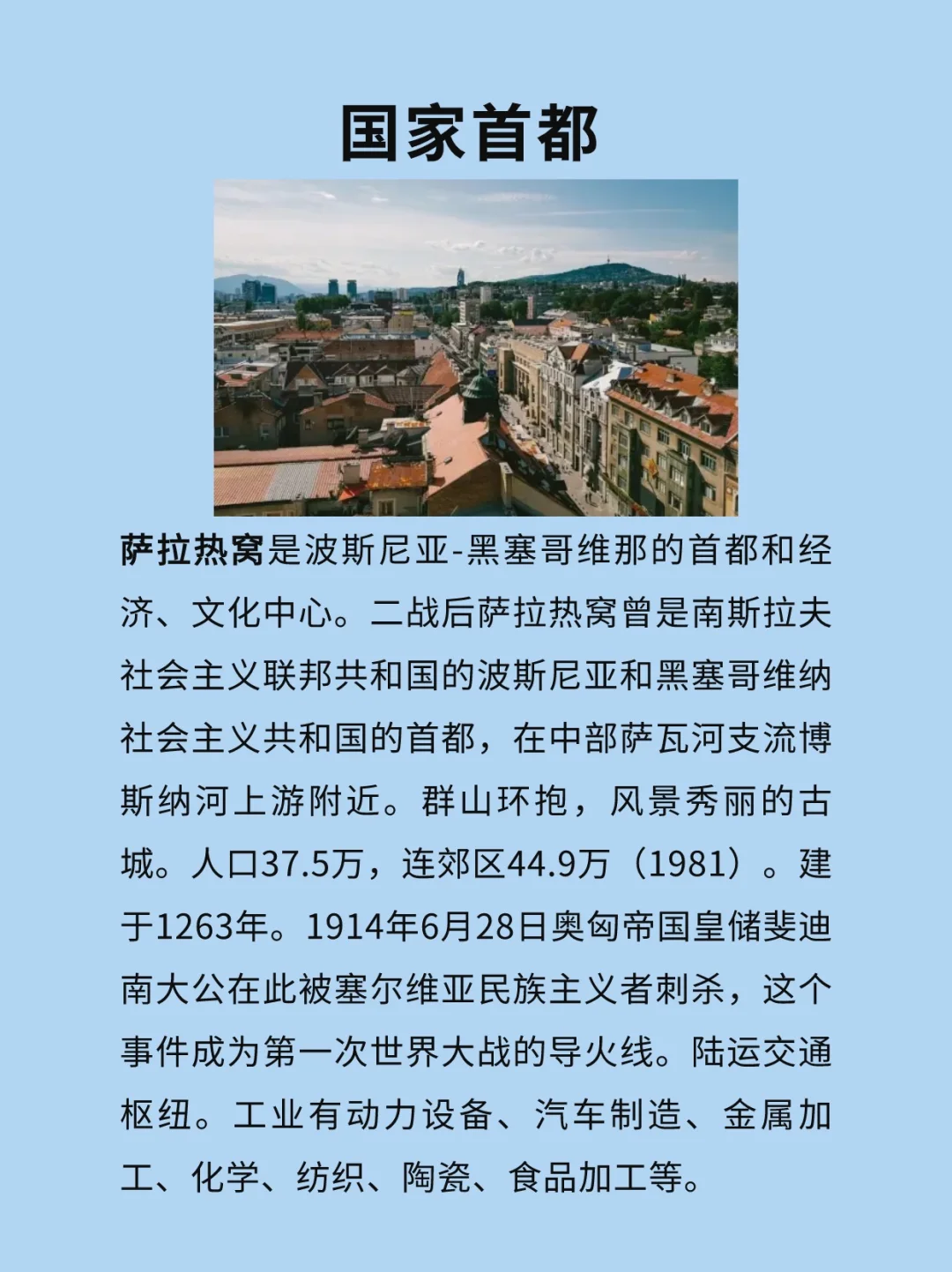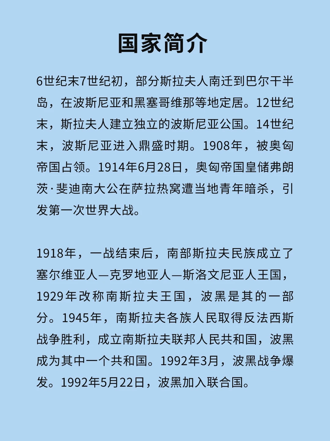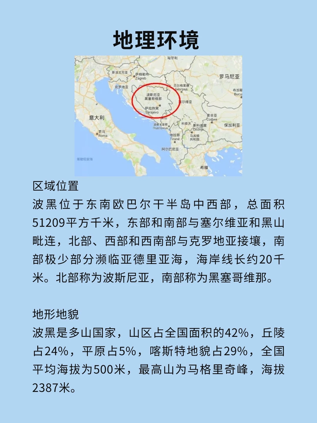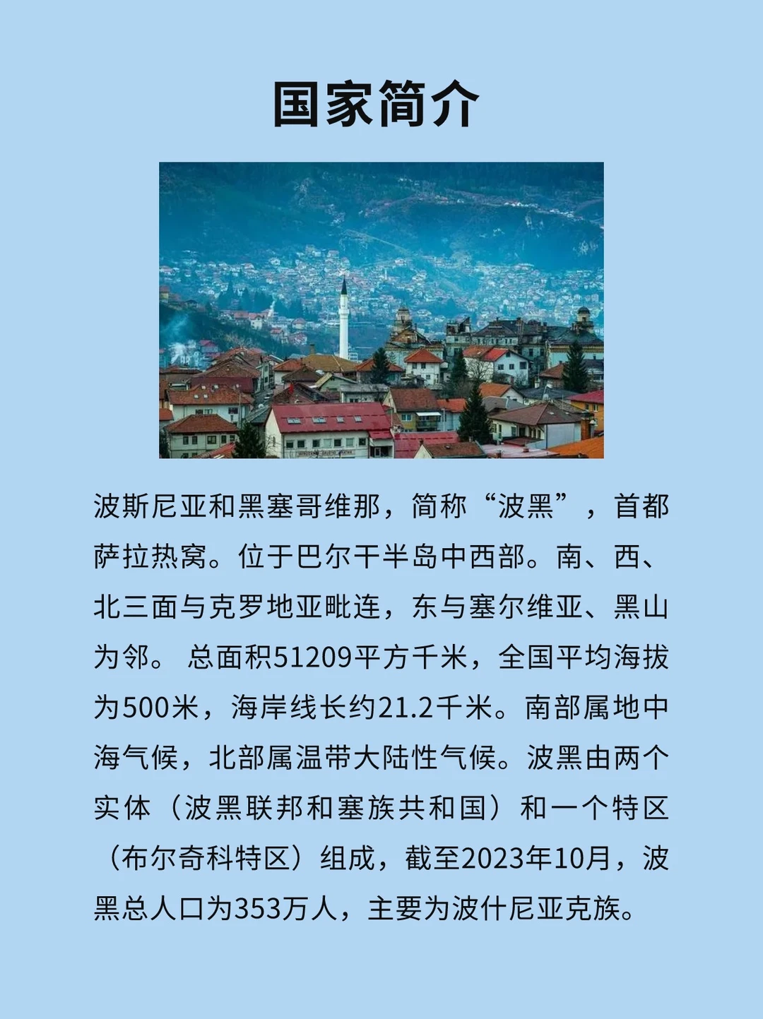 [打卡R]波斯尼亚和黑塞哥维那,简称“波黑”,首都萨拉热窝。位于巴尔干半岛中西部。南、西、北三面与克罗地亚毗连,东与塞尔维亚、黑山为邻。 [种草R]总面积51209平方千米,全国平均海拔为500米,海岸线长约21.2千米。南部属地中海气候,北部属温带大陆性气候。 [飞盘R]波黑由两个实体(波黑联邦和塞族共和国)和一个特区(布尔奇科特区)组成,截至2023年10月,波黑总人口为353万人,主要为波什尼亚克族。