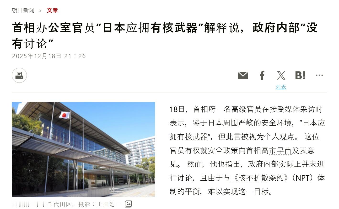 日本高级官员称日本应该拥有核武器——朝日新闻报道,12月18号,日本首相办公室一