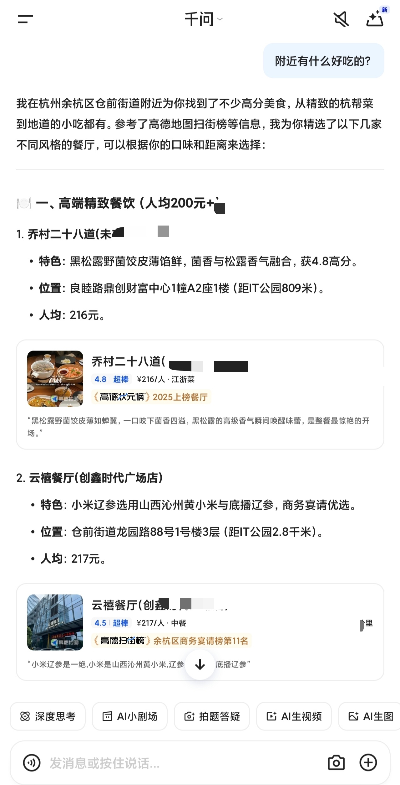 千问APP接入阿里生态场景 阿里这次让千问连上高德,有点意思。千问先打通各个App,当千问成为系统级应用,调动更多的应用,剩下的估计就是做Ai手机了。高德有了千问,能带你找馆子、订酒店、规划路线,以前它告诉你有什么,现在它能帮你怎么去,帮你思考规划这点很关键。下指令,可以连续自动化操作,一个帮你省掉手动切换App,更加丝滑一气呵成,感觉自己不用带脑子了,动嘴说说就好。Ai的发展速度很快的,不超过五年就可以成熟了,感觉已经出现了未来手机操作的雏形,技术改变操作逻辑,也是一次软件厂商的洗牌。高德接入阿里千问App