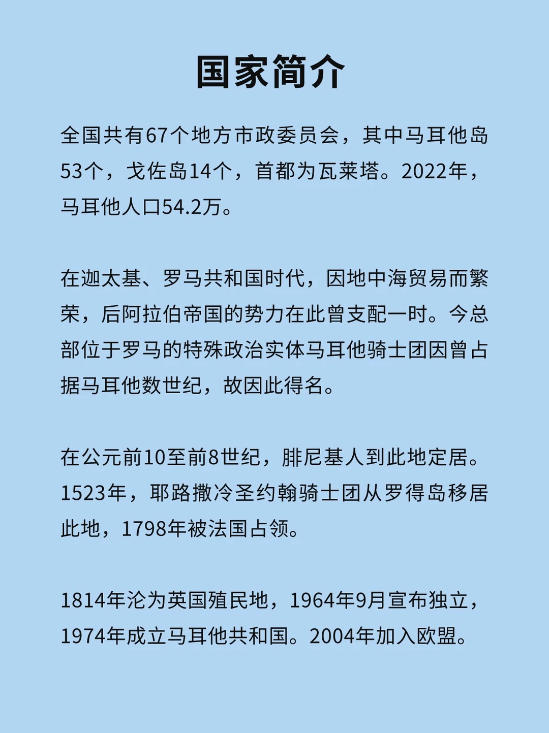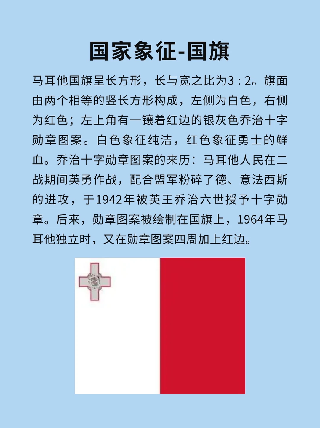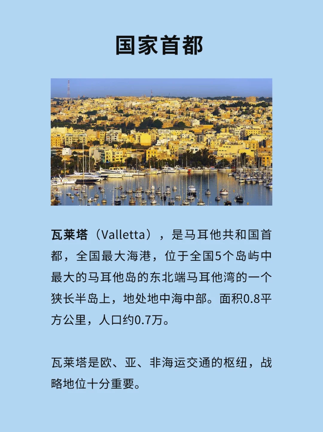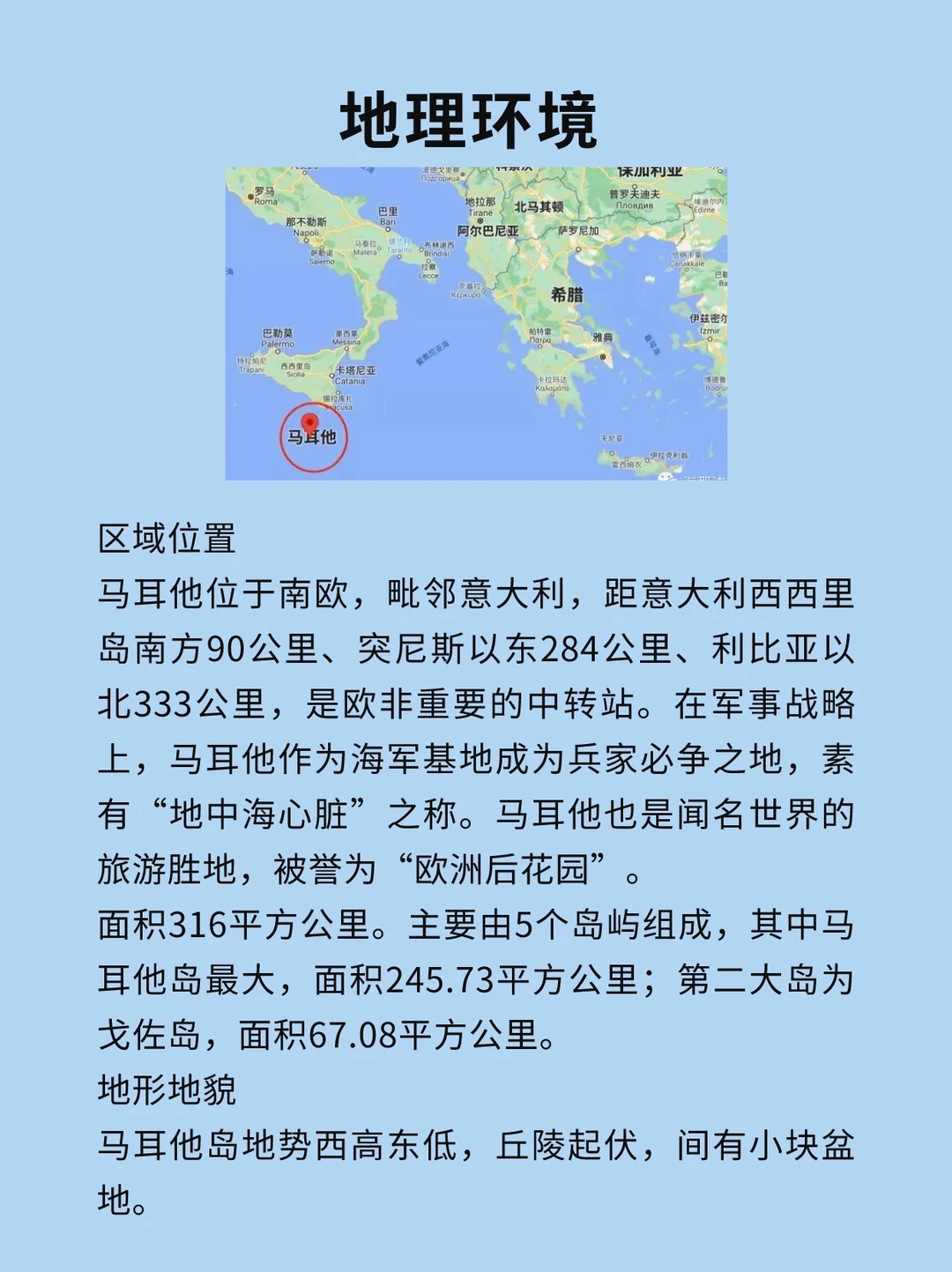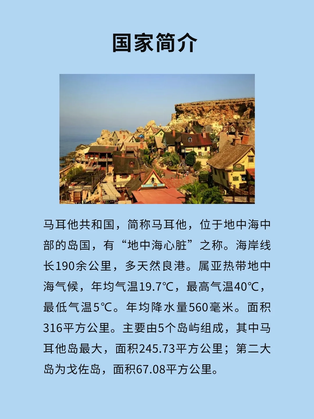 🇲🇹马耳他共和国,简称马耳他,位于地中海中部的岛国,有“地中海心脏”之称。海岸线长190余公里,多天然良港。属亚热带地中海气候,年均气温19.7℃,最高气温40℃,最低气温5℃。年均降水量560毫米。面积316平方公里。