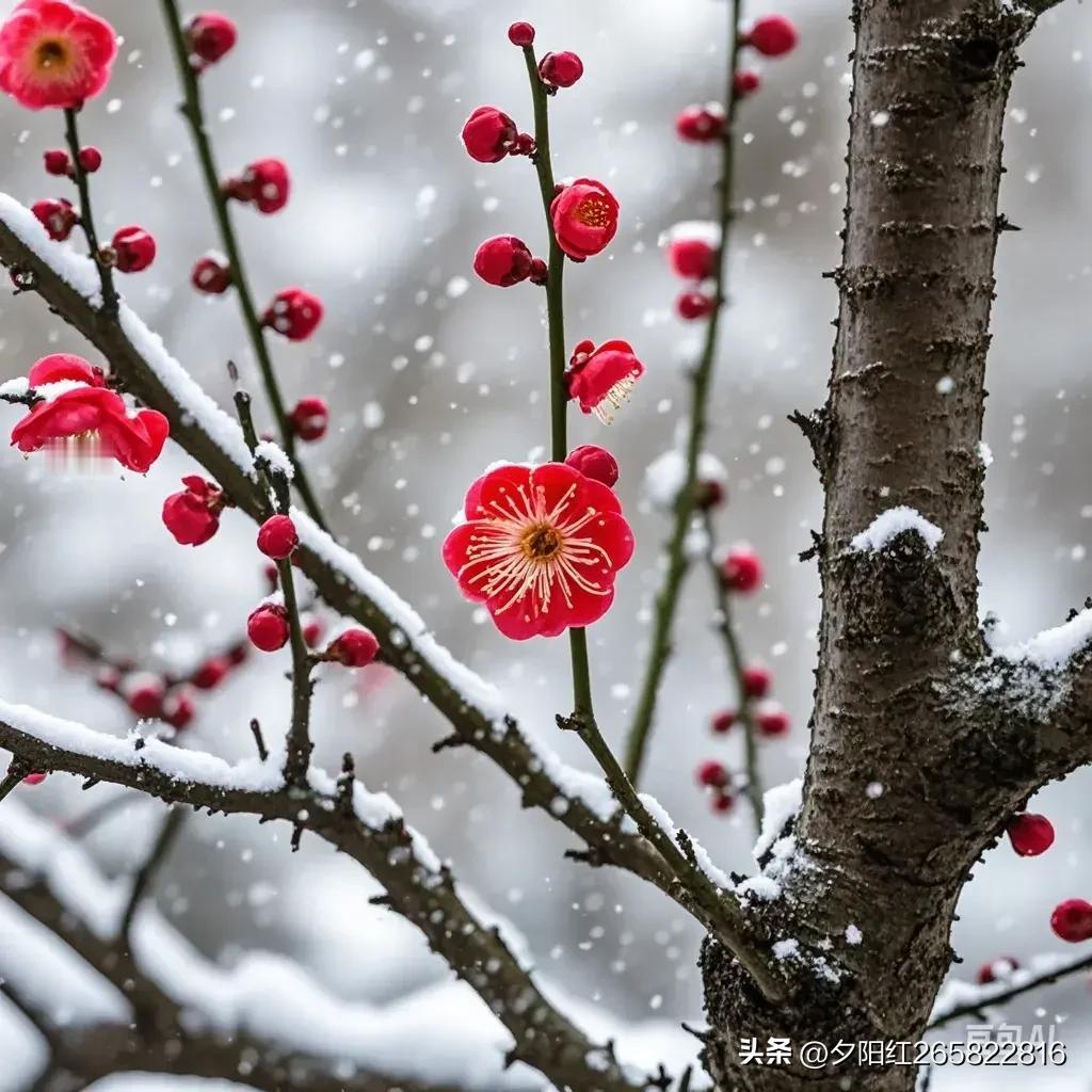 上联:红梅含苞傲冬雪 下联:绿柳绽叶舞春风