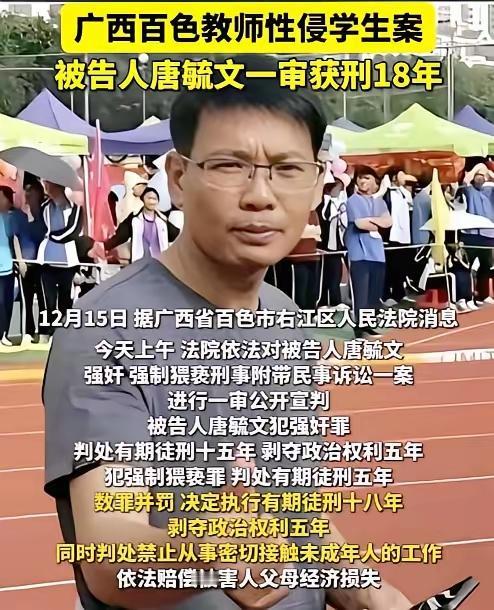 广西一名教师唐毓文,因多次对学生实施性侵被曝光,更让人意外的是,他的妻子还是街道办事处主任,两人已经有了两个孩子。这个看似体面的家庭背后,竟然藏着这样令人发指的恶行。 老师本应该是守护着学生的人,可他却借着自己的身份伤害那些最单纯的孩子,这种行为真的该好好严惩!更让人难过的是,这样的悲剧常常是在孩子不敢说、家长没察觉的沉默里悄悄上演。光靠事后惩罚远远不够,性教育得从初中就开始重视,用这些真实发生的案例,让孩子们学会怎么分辨身边的危险。 要想护住孩子,得靠家里、学校和社会一起搭起一张安全的防护网。家里的大人得留意孩子有没有突然的情绪变化,学校得有更严格的监督办法,整个社会都得对这种事零容忍。每个孩子本来都该被温柔对待,咱们可不能再让这样的事重演了。 这件事也给我们提了个醒:看着体面的人,心里可能并不干净。坏人说不定就藏在咱们身边,真的得提高点小心。你在生活里有没有碰见过类似的事?或者有什么想法,都来评论区说说吧。未成年女生性侵 性侵案 高中女生被性侵 性侵 教师性侵学生 教师强奸案 广西校园性侵案