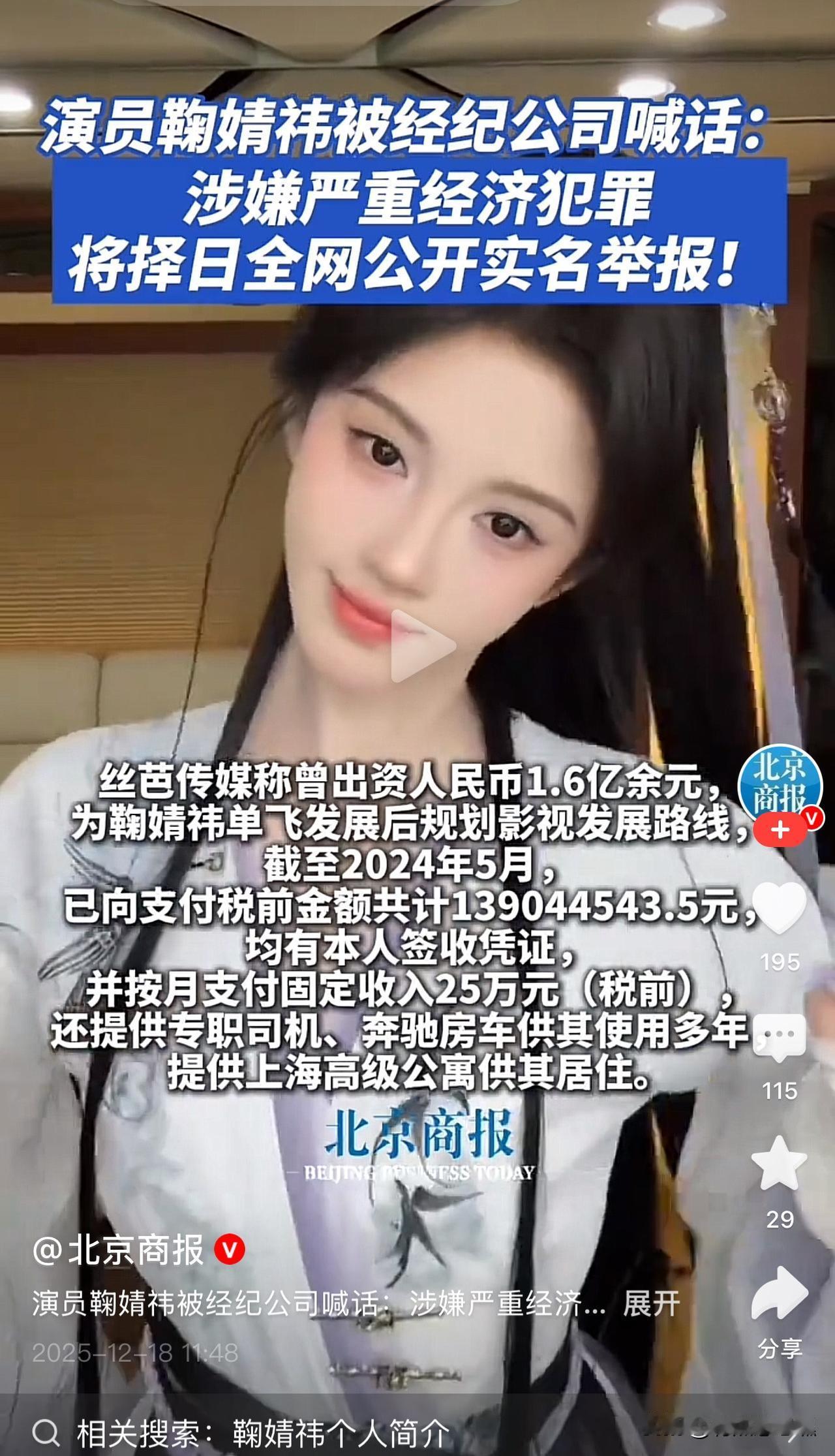 4000年美女涉嫌犯罪? 近日,丝芭传媒将向相关监管机构举报其麾下员工鞠婧祎涉嫌经济犯罪。 鞠婧祎只是一名员工,她能有什么经济犯罪行为?不过,人家月收入竟然25万元,虽说是税前,那也是天价高薪了。 根据通告中特意标注的税前25万,我想大概率“涉嫌经济犯罪”,也就只能是偷税漏税了。 可是作为一个艺人,按说给员工发工资不是应该是税后么,因为通过银行转账,如果标注工资是自动扣税的,如果是劳务,税率就更高了。 拭目以待吧。 ————————