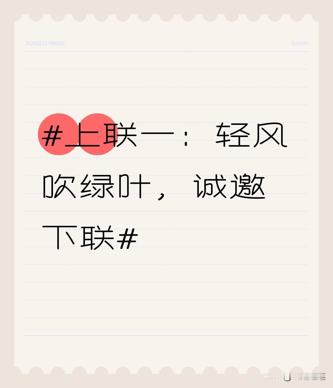 看到“轻风吹绿叶”这个上联,感觉画面一下子清新起来了,微风轻拂,绿叶摇曳,充满了生机。我觉得“细雨润花香”这个下联就很不错。轻柔的细雨滋润着花朵,让花香更浓郁,和上联的意境很搭,都是那种悠然闲适又美好的画面。而且“轻风”对“细雨”,“吹”对“润”,“绿叶”对“花香”,对仗工整。当然啦,对联的好下联可能不止一个,说不定还有其他更妙的下联等着被发掘呢,大家也可以开动脑筋想一想。