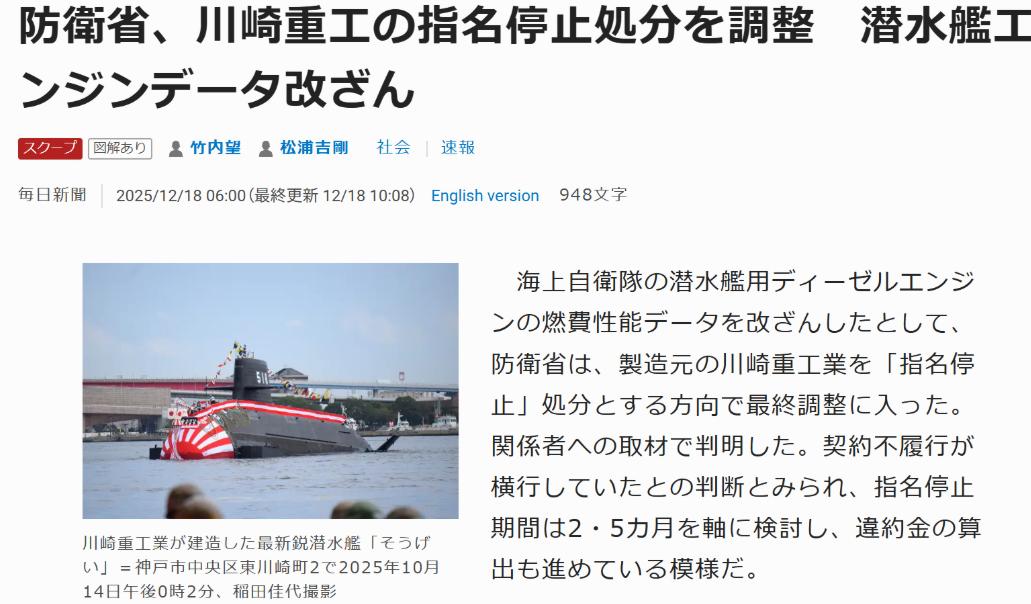 【日本再出造假仙人,潜艇发动机货不对板,自卫队水下力量被“重创”】 周四,日本防卫省宣布,将暂停川崎重工竞标自卫队项目的权限,时长两个半月。理由是有调查人员发现,川崎重工存在长期造假、虚标产品性能的问题,尤其是柴油机,全都是性能货不对板的残次品。 此次造假事件影响甚广,光是海上自卫队就有亲潮级、苍龙级、大鲸级潜艇中招,这基本上是海自全部水下力量了。由此引发的问题就是,海自潜艇的综合作战能力必然会受到影响。 不过就算捅了这么大篓子,自卫队也只是暂停川崎重工两个半月的竞标权限,因为他们是自卫队的主要零部件和设备供应商。真要往下查,自卫队也没东西能用了。只能罚酒三杯。