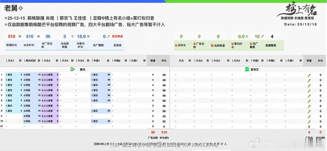 郭京飞、王佳佳老舅 开播第4日爱奇艺热度7313,较前日+203腾讯热度25580,较前日+430鹅桃增幅还都不错,两云日增播放量上3000万没啥悬念了招商鹅还不错,总时长510s桃🥕×10酷云收视率昨晚集均涨到2.4+,1-8集均2.24