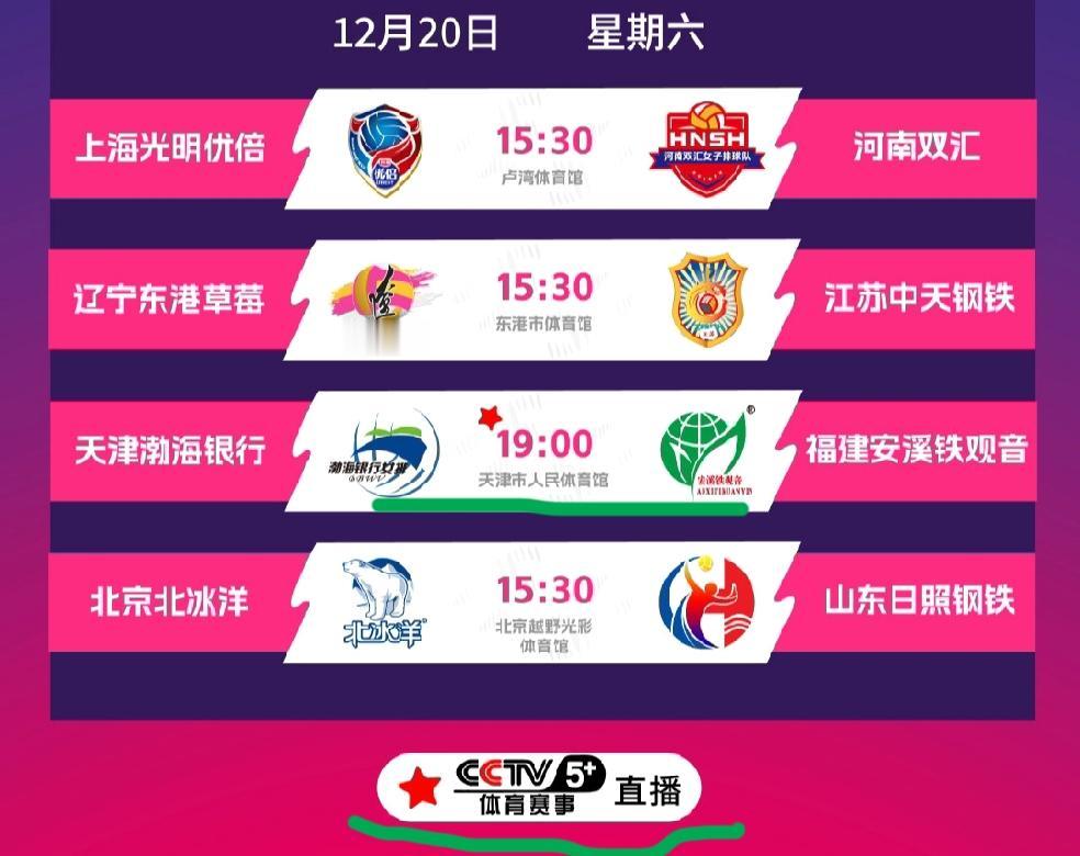周六赛程有变更!第三轮比赛时间有变更!央视体育频道CCTV5+直播天津女排的比赛! 新赛季排超联赛官方发文,周六第三轮比赛时间有变化!三场比赛都安排在周六下午三点半开打!一场比赛安排在晚上七点开打。 央视体育频道CCTV5+直播的天津女排的比赛! 12月20日,中国女子排球超级联赛 A级常规赛第3轮展开争夺,具体赛程如下: 15:30 上海光明优倍 vs 河南双汇 15:30 辽宁东港草莓 vs 江苏中天钢铁 15:30 北京北冰洋 vs 山东日照钢铁 19:00 天津渤海银行 vs 福建安溪铁观音(CCTV5+直播) 周六下午三点半同时开打的三场比赛,可以重点关注北京女排对阵山东女排的比赛。这场比赛双方队伍势均力敌。 北京女排有三外援加盟,还有世俱杯最佳自由人刘立雯加盟。北京女排主场作战,有望拿下第二场比赛的胜利! 周六晚上的焦点战天津女排对阵福建女排的比赛。天津女排的比赛,相信大多都是五局大战的比赛。 央视体育频道直播本场比赛!天津女排主场比赛的直播信号,也是排超联赛中直播信号最好最专业的信号。又可以在电视上看到天津女排的比赛了! 除了央视体育频道直播天津女排的比赛,天津电视台体育频道也会直播本场比赛。期待天津女排取得好成绩!欢迎点赞评论,拒绝抄袭,天涯体育排球讯