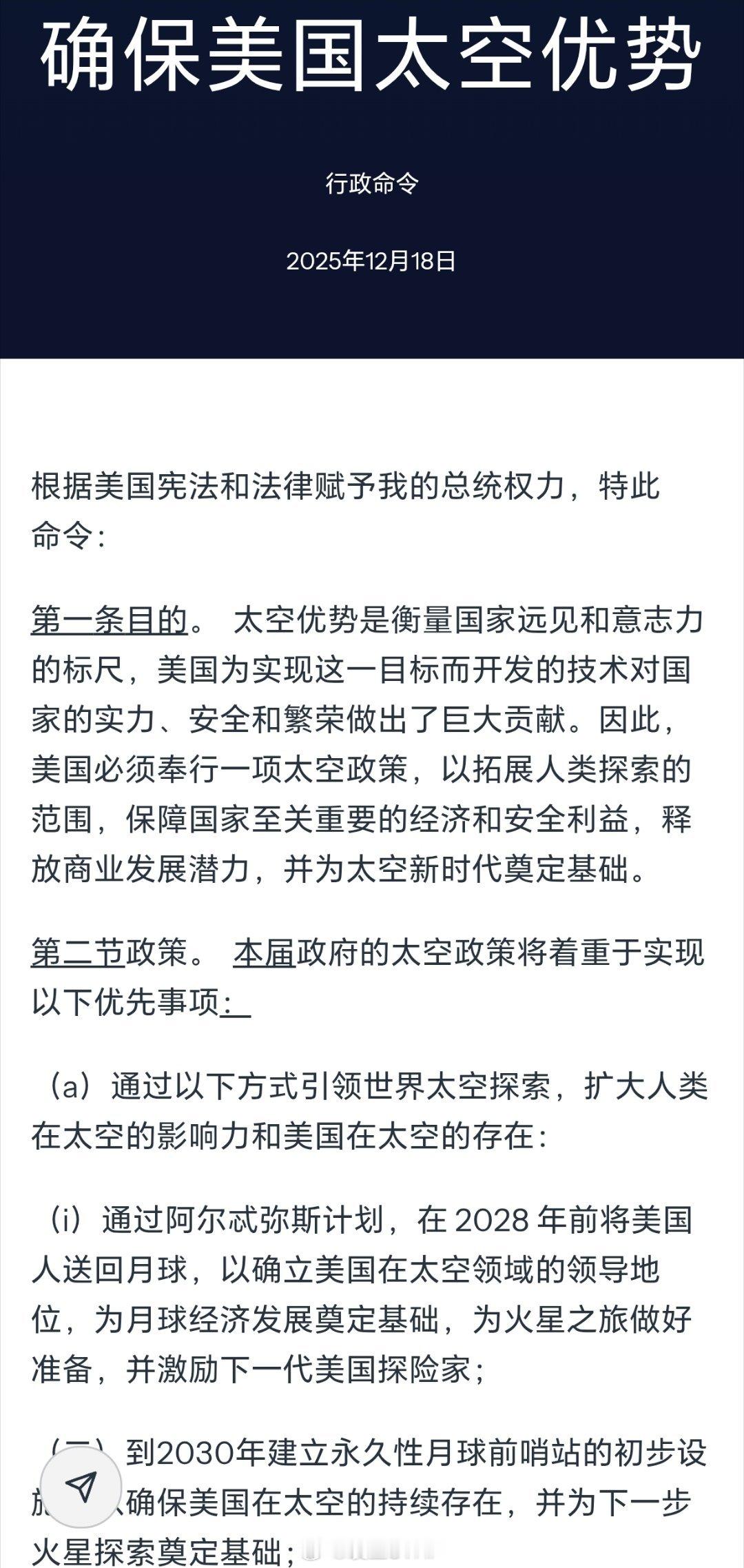 特朗普下令要求美国人2028年登月美国白宫发表声明称,特朗普签署了一项行政命令,为“美国优先”的太空政策制定了愿景,以确保美国在太空探索、安全和商业领域“引领世界”。该命令要求美国人到2028年重返月球,以确立美国在太空领域的领导地位。到2030年建立永久性月球前哨站的初步设施,以确保美国在太空的持续存在,并为下一步火星探索奠定基础。
