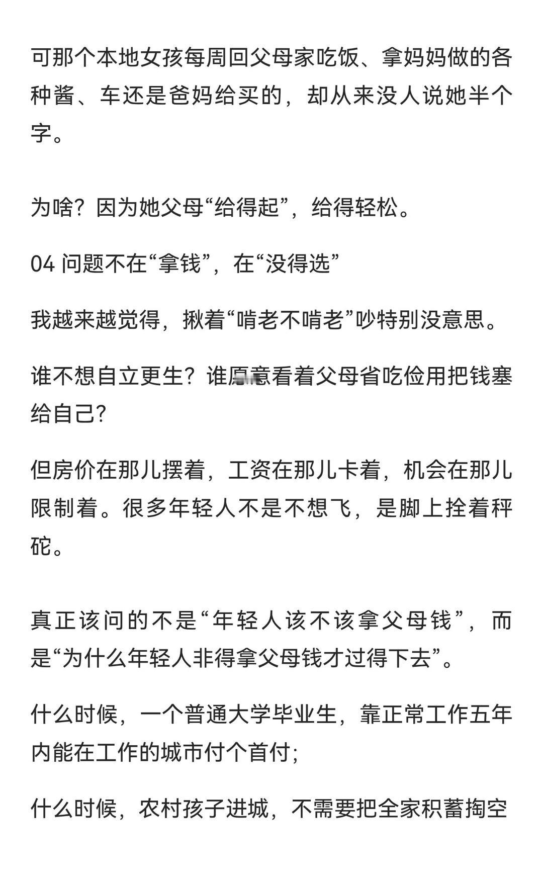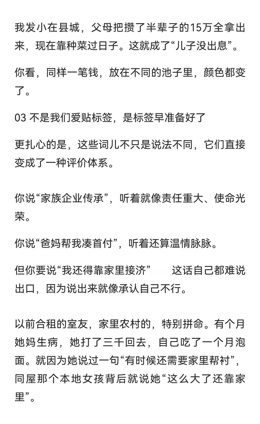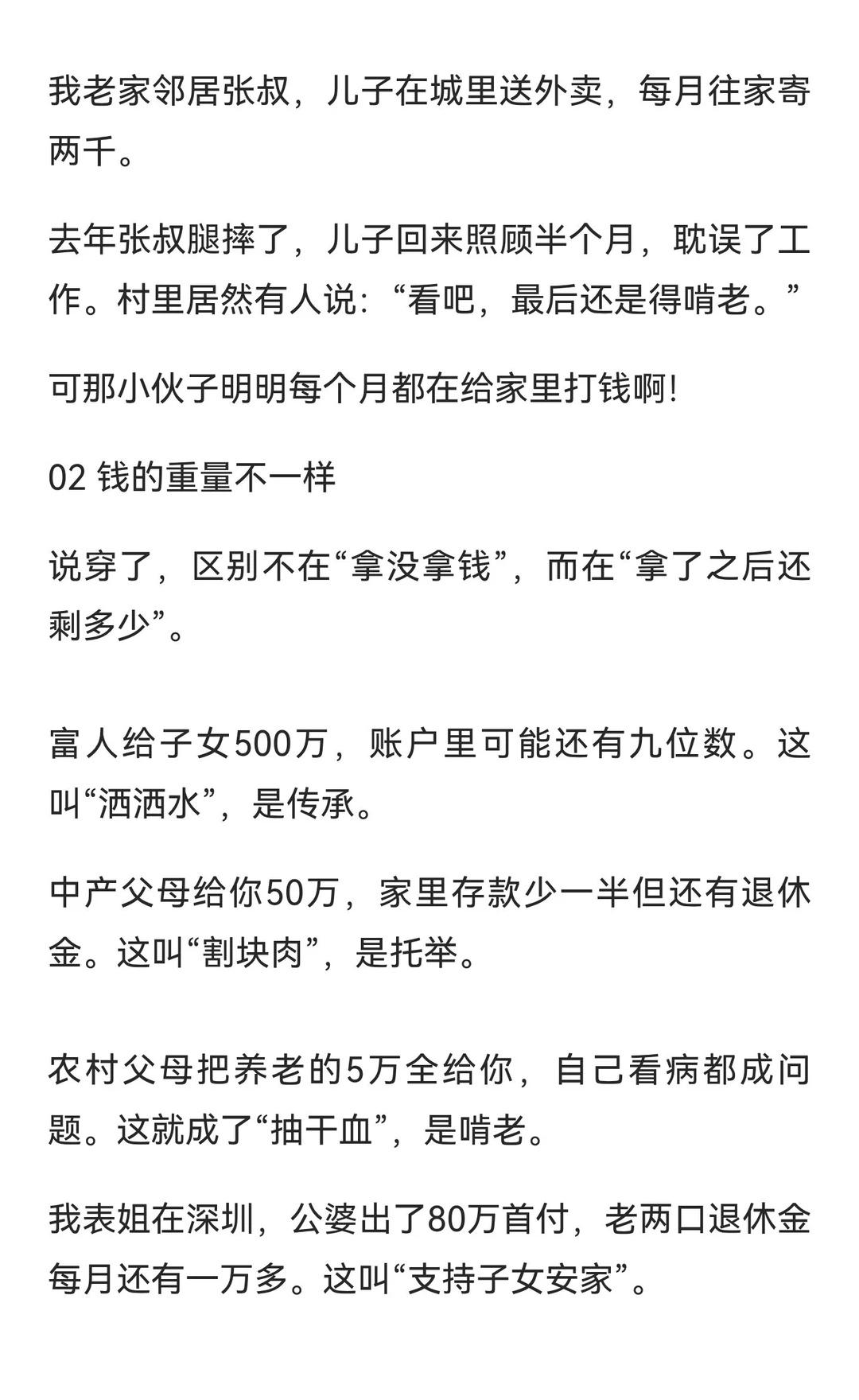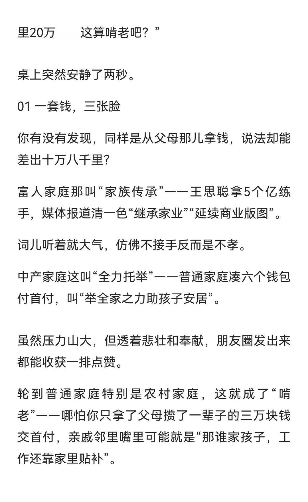 同样是花父母钱,为啥叫法差这么多? 从父母处拿钱买房,说法却能差出十万八千里。富人叫“家族传承”,中产叫“全力托举”,普通家庭则成“啃老”。真正的问题不在于“拿没拿钱”,而在于年轻人是否能自立更生。有钱人教育子女 贫富差距巨大 对钱没概念 富人和穷人的区别 贫穷限制了我的想象 传统家庭观念 消费主义的陷阱 居民消费水平
