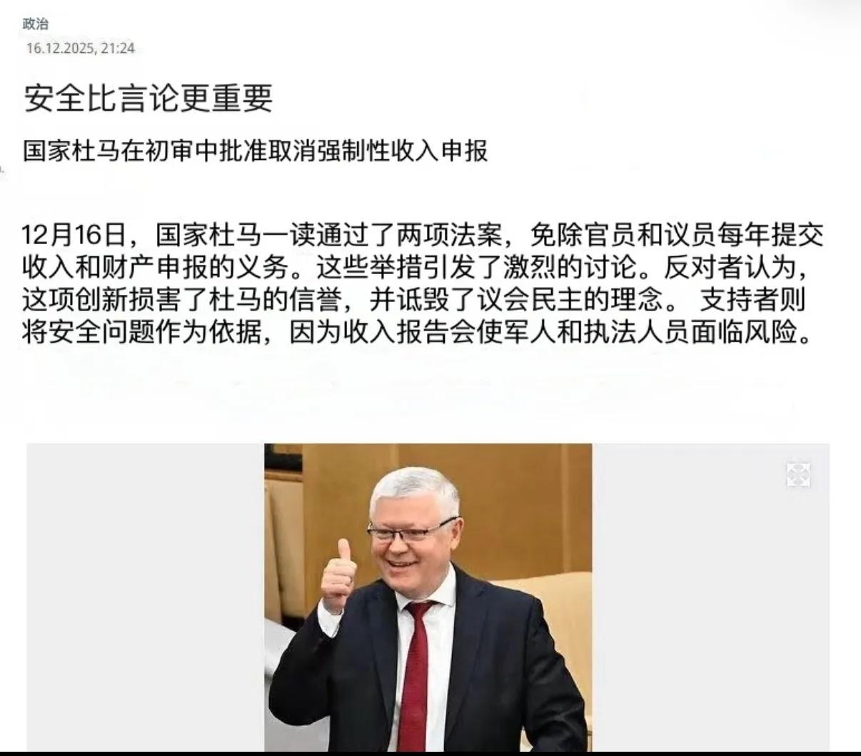 俄罗斯国家杜马一读通过法案,取消了国家guan-员-必须公布财产的规定。俄罗斯法案