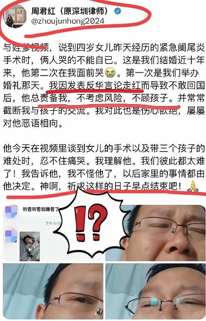 原深圳律师周君红12月15日发文哀嚎,说自己因为反华回不了国,女儿手术无法在身边,遭老公抱怨,两人视频痛哭真的是自作孽不可活! 原深圳律师周君红的哭惨文,看完没人同情反而想骂。 现在在境外靠打零工糊口的周君红,恐怕很难想起自己当年在深圳当律师的风光日子。 以前她手握合法执业证书,办公环境整洁体面,书柜里摆满了处理过的案件判决书,靠着专业能力过得安稳又有面子。 如今却要放下身段,在餐厅端盘子、超市理货,住狭小破旧的公寓,冬天暖气时好时坏,夜里常被冻醒。 但当大家弄清背后的缘由,共情很快就变成了“不值得”。 这场痛哭的根源,是他们的女儿即将手术,作为母亲的周君红却回不了国陪伴。 可这并非外力阻拦,而是她自己多年前就开始的一系列错误选择,最终把自己困在了境外,连守护孩子的基本权利都弄丢了。 要读懂这件事,不用纠结复杂的舆论争议,核心就是“一个选择如何毁掉一个家庭”。 我们先把目光放在这个风雨飘摇的家庭上,再回头看周君红是怎么一步步偏离正轨的。 对这个家庭来说,女儿的手术成了压垮骆驼的最后一根稻草。 周君红的丈夫在视频里哭着倾诉,自己一个人扛下了所有:白天跑医院照顾孩子,晚上还要打理家里的琐事,日复一日的奔波让他彻底崩溃,连一句“撑不住了”都带着哽咽。 更让人唏嘘的是,这对夫妻的关系早已破裂,之所以没走到离婚那一步,只是因为还有没理清的利益纠葛。 这场跨越山海的痛哭,不是夫妻间的深情流露,更像是长期压抑后的情绪爆发,里面藏着的全是埋怨和无力。 整个事件里,最无辜的就是那个要上手术台的孩子。 她不仅要承受手术带来的身体疼痛,还要面对“妈妈不在身边”的委屈。 更让人担心的是,未来她可能会因为妈妈的过往,在学校里被同学议论,这份心理压力,或许会成为她成长路上的阴影。 一边是家里的兵荒马乱,一边是周君红在境外的窘迫求生。 很难想象,如今靠打零工糊口的她,曾经是深圳法律圈小有名气的律师。 那时候的她,手握合法执业证书,办公环境体面,书柜里摆满了处理过的案件判决书,靠着专业能力过着安稳体面的日子,妥妥地享受着国家发展带来的红利。 可现在的她,早就没了当年的风光。 为了活下去,她不得不放下曾经的职业尊严,去餐厅端盘子、去超市理货,做着以前根本不会正眼瞧的体力活。 租住的公寓狭小又破旧,冬天暖气时好时坏,夜里常常被冻醒。 这些难处她从来不敢跟家里说,每次视频都要特意收拾一番,强装出过得很好的样子,直到这次女儿手术,这份伪装才彻底被戳破。 回溯一下她的转变过程,其实很清晰。 当年她在深圳当律师的时候,算是行业里的佼佼者,有合法的执业证书,书柜里摆满了处理过的案件判决书,靠着自己的专业能力,日子过得安稳又有面子。 国家给了她执业的平台,她也享受到了社会发展带来的红利,可她偏偏不珍惜,非要走歪路。 一开始,她只是在境外社交平台发布一些反华言论,初衷很简单,就是想博眼球、赚流量。 看着评论区里一些陌生账号的附和,她甚至产生了错觉,觉得自己站在了所谓的“制高点”上。 后来她的胆子越来越大,不再满足于简单的言论输出,开始编造虚假信息制造负面舆论,把博眼球的私心放在了第一位,彻底突破了职业操守的底线。 面对越来越大的舆论压力,以及可能要承担的后果,周君红没有选择反思悔改,反而选择了逃避。 她注销了国内所有的社交账号,甚至和老家年迈的父母断绝了联系,仓促地逃到了境外,至于具体去了哪里,有人说在东南亚,也有人说去了美国。 可逃避并没有解决问题,反而让她陷入了更尴尬的境地。 在境外,她没有稳定的身份,也没有熟悉的社交圈子,语言不通、文化隔阂,根本融入不了当地的主流社会。 周君红在发文中,反复强调自己的痛苦和无助,说自己回不了国、见不到孩子,却刻意回避了最核心的问题——她为什么会落到今天这个地步。 作为一名曾经的律师,她本该比普通人更懂法,更清楚什么能做、什么不能做,更该有基本的爱国情怀。 可她却利用自己的身份和学识,做着损害国家利益的事情,最终断送了自己的前途,也毁了原本安稳的家庭。 现在再怎么痛哭哀嚎,也改变不了已经发生的事实。 路是自己选的,再苦的果也只能自己咽下去。 毕竟,大人的错误,不应该让无辜的孩子来承担。 如果各位看官老爷们已经选择阅读了此文,麻烦您点一下关注,既方便您进行讨论和分享,又能带来不一样的参与感,感谢各位看官老爷们的支持!