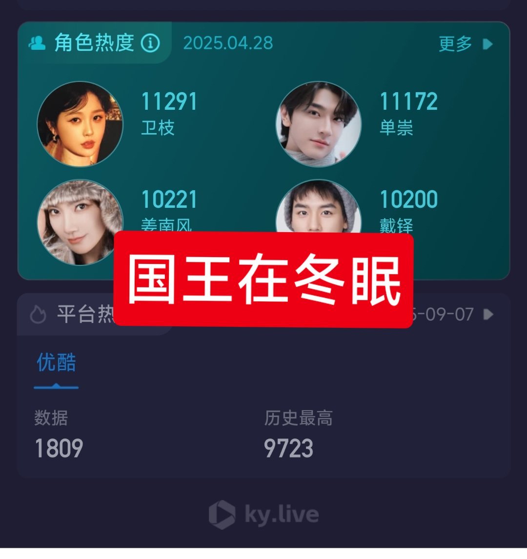 虞书欣泰国年度风云人物 虞书欣2025年播的两部现偶——❶《双轨》爱奇艺站内最高热度8462。❷《嘘,国王在冬眠》优酷最高热度9723。这个级别算是扑了吗?