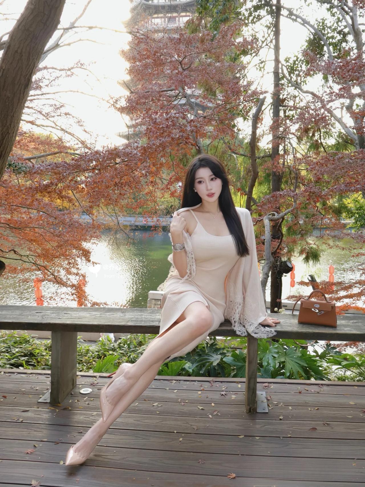 秋日暖阳下,优雅女子倚栏而坐,红叶映衬,美不胜收。