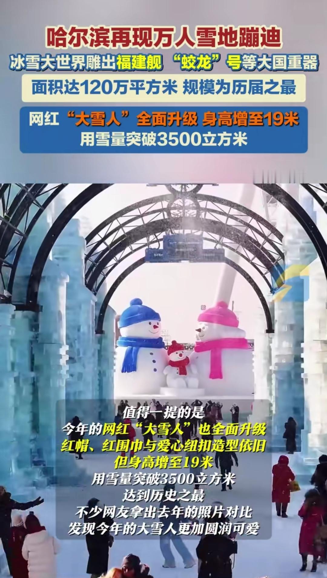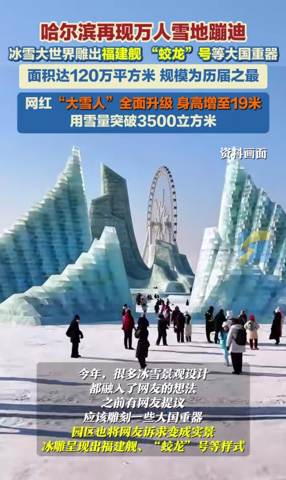 零下20℃的哈尔滨街头,上万人顶着寒风在雪地蹦迪,尖叫声盖过音乐,连呼出的白气都透着兴奋——这场景里藏着的,远比热闹更戳人。 今年冰雪大世界玩出了新花样,“福建舰”冰雕雄赳赳立在雪地,“蛟龙”号冰塑仿佛要破冰而出,逛一圈像打卡了半个大国重器图鉴。白天看冰雕晶莹剔透,晚上灯光一亮,整个园区美成童话,大人小孩都玩疯了。 可这热闹背后,是工人们顶着严寒雕冰的坚守,是当地人把“南方小土豆”宠成宝的热忱,更是大家对生活的热爱。从冰天雪地里的欢声笑语,到大国重器融入日常的自豪,我们总在平凡场景里,遇见最鲜活的幸福感。 其实快乐从不需要昂贵的成本,一片雪地、一场狂欢、一份对生活的热忱,就足够温暖整个冬天。
