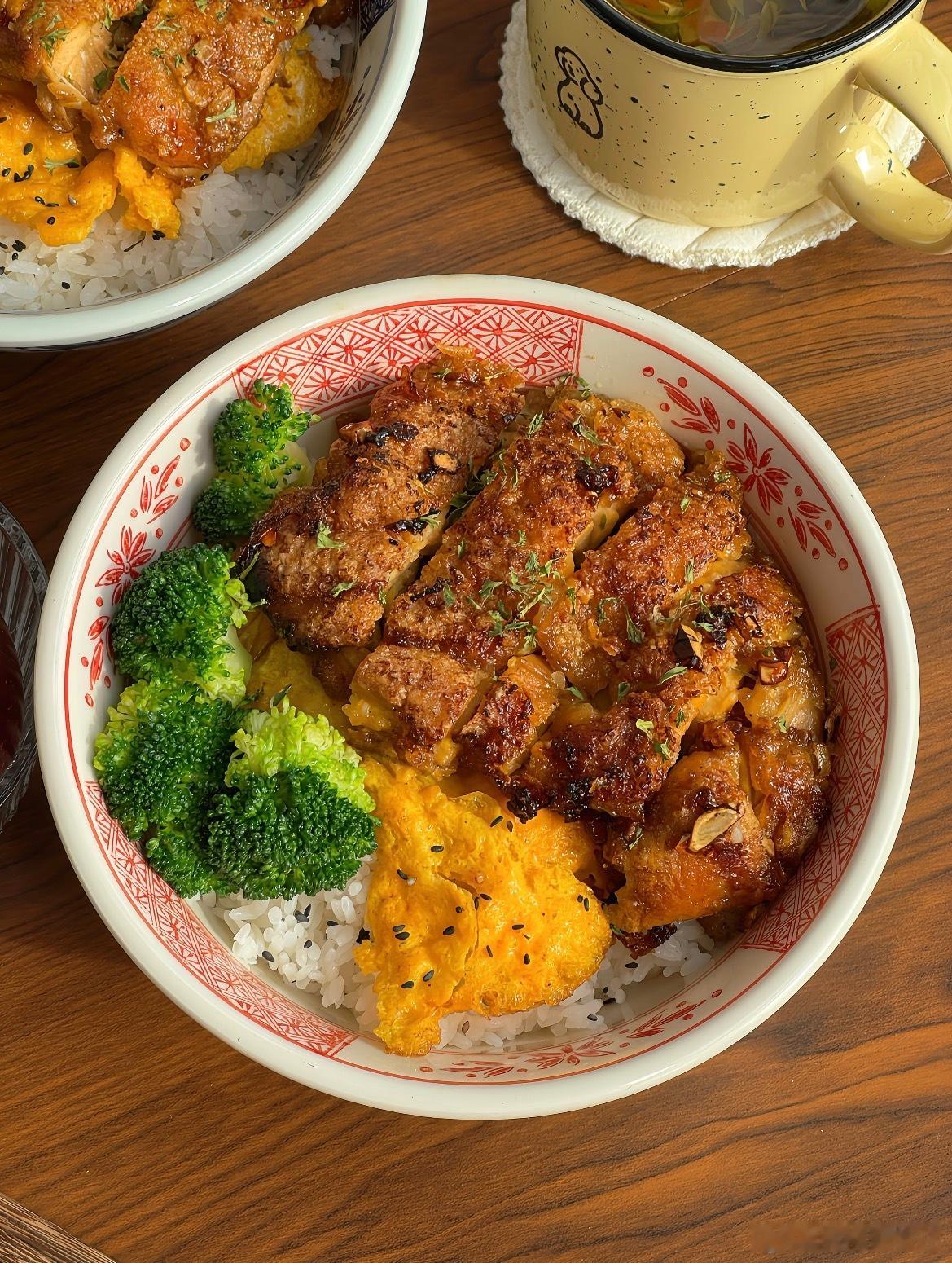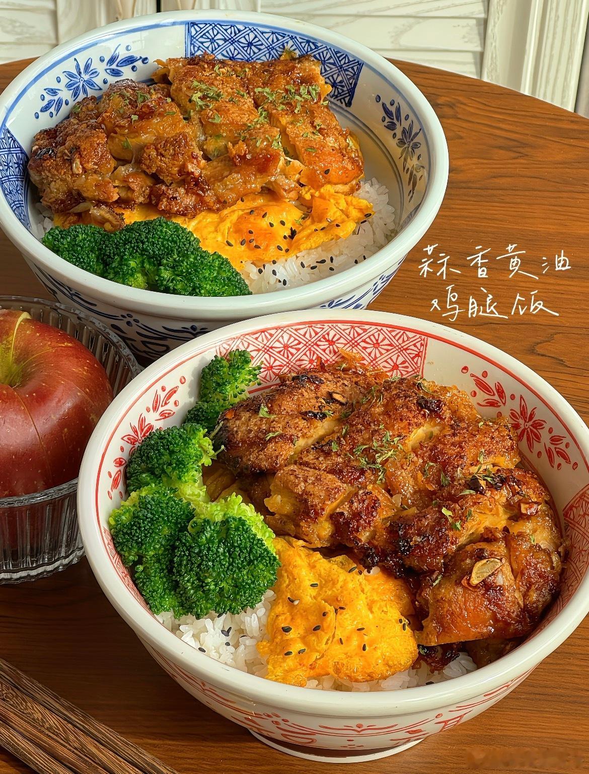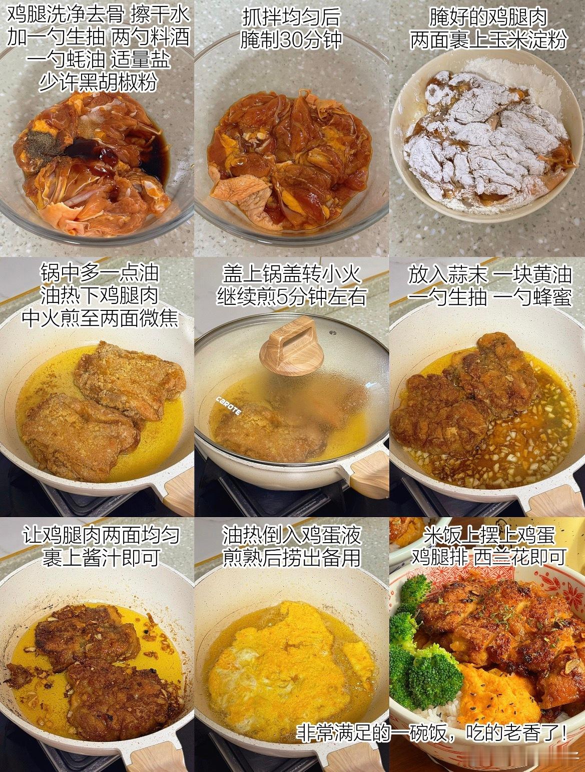 大大的鸡腿排这也太满足了!!蒜香浓郁混着蜂蜜黄油的香甜滋味,鸡腿外焦里嫩,一口爆汁,再来一大口香香的大米饭,吃的停不下来🤤详细的教程放下面了,快试试吧!【蒜香黄油鸡腿排饭】🍗食材准备:鸡腿、鸡蛋、西兰花、黄油、蜂蜜、蒜、欧芹碎、黑芝麻📝步骤:1️⃣鸡腿洗净去骨,擦干水,加一勺生抽、两勺料酒、一勺蚝油、适量盐、少许黑胡椒粉,抓拌均匀后腌制30分钟2️⃣腌好的鸡腿肉两面裹上玉米淀粉3️⃣锅中多一点油,油热下鸡腿肉,中火煎至两面微焦4️⃣盖上锅盖转小火,继续煎5分钟左右5️⃣放入蒜末、一块黄油、一勺生抽、一勺蜂蜜,让鸡腿肉两面均匀裹上酱汁即可6️⃣油热倒入鸡蛋液,煎熟后捞出备用7️⃣米饭上摆上鸡蛋、鸡腿排、西兰花,最后撒一些欧芹碎,黑芝麻装饰即可!组个冬日养生局温暖的食光兴趣稀引力计划