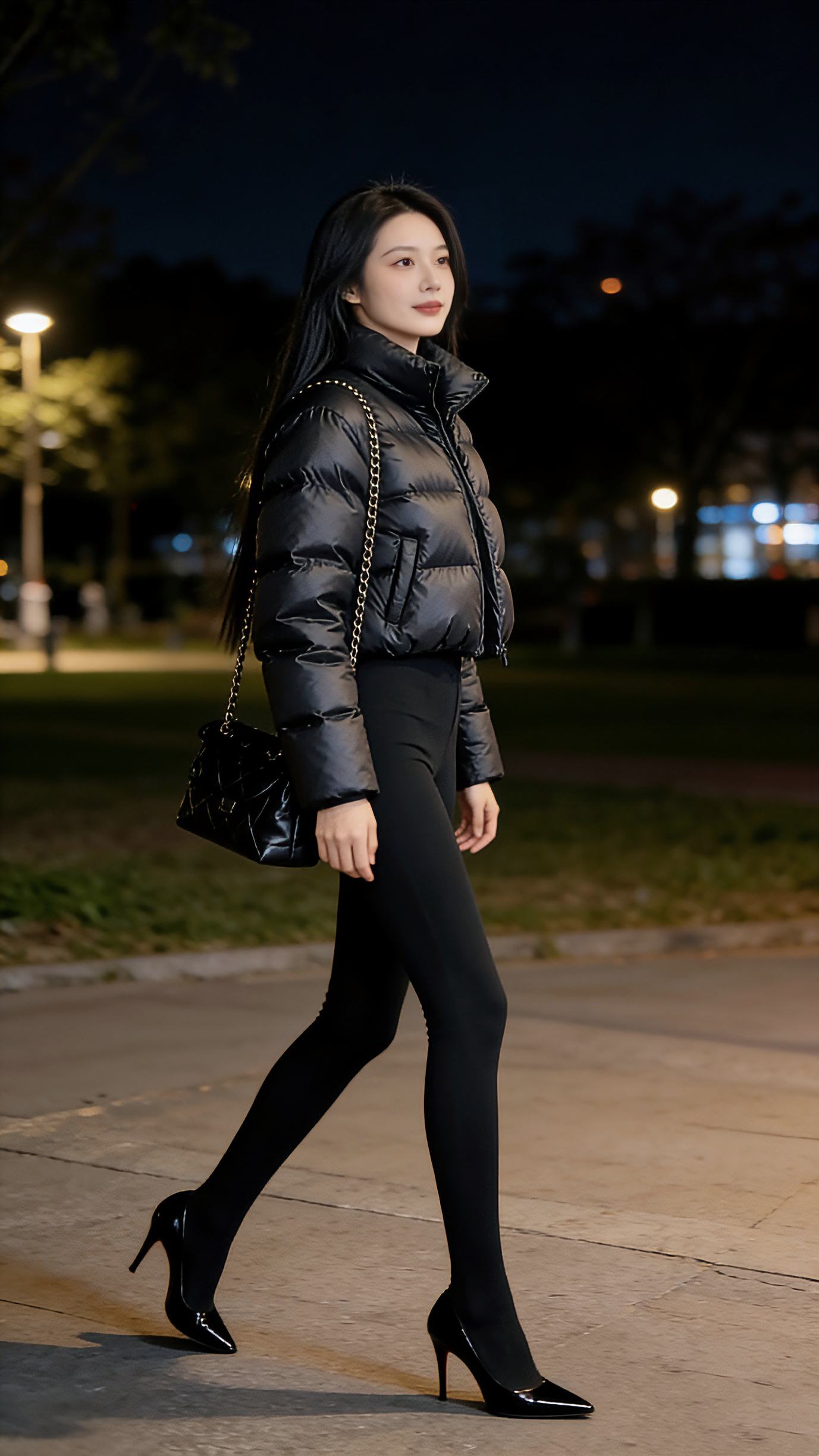 冬日夜色里的魅力身姿,黑色短款羽绒服街拍。