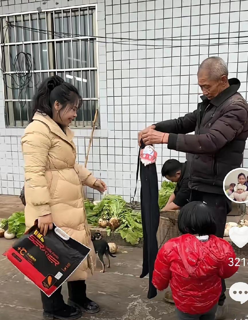 英子带着羽绒服回村看农村四哥的家人了,看王爸身上那件衣服破了几个大洞又拿针线给缝