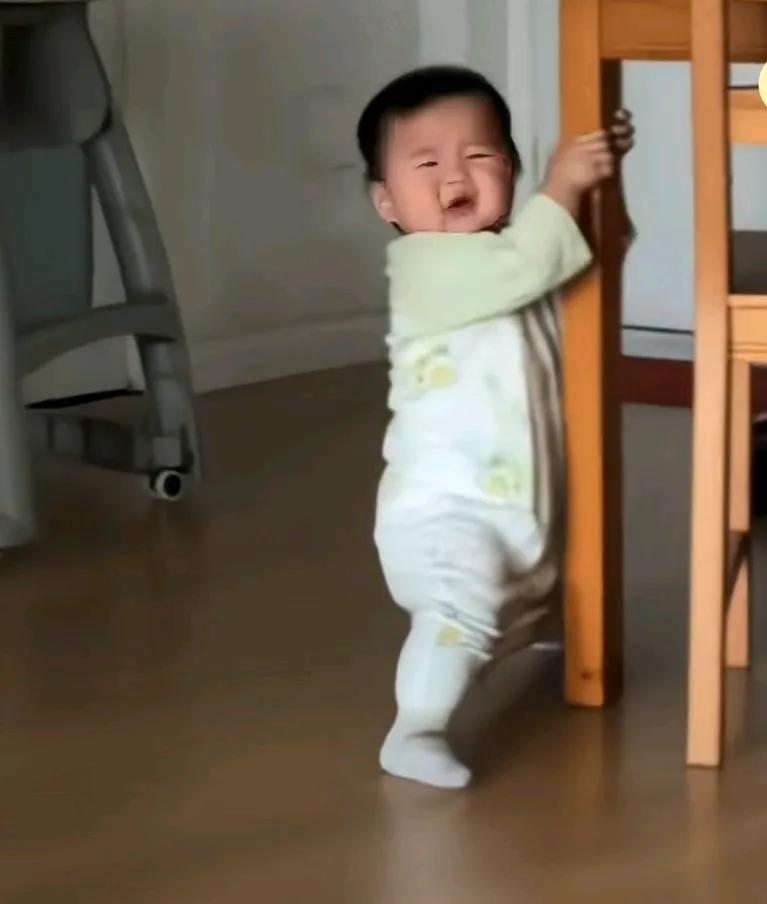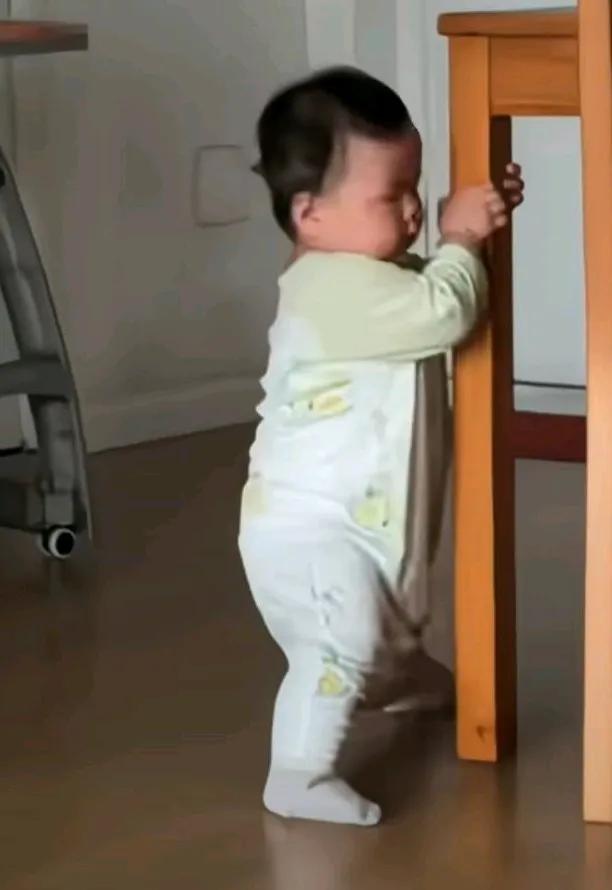 学走路的宝宝穿的袜子太滑,拉着桌子,急得直摇头, 怪就怪说也说不清, 说不出来啥原因, 自己在那劈叉呢, 宝宝可能心里在说, 我可不想学劈叉。 急得大喊起来, 还是光脚好, 光脚学走路比较快, 穿袜子太费事了!