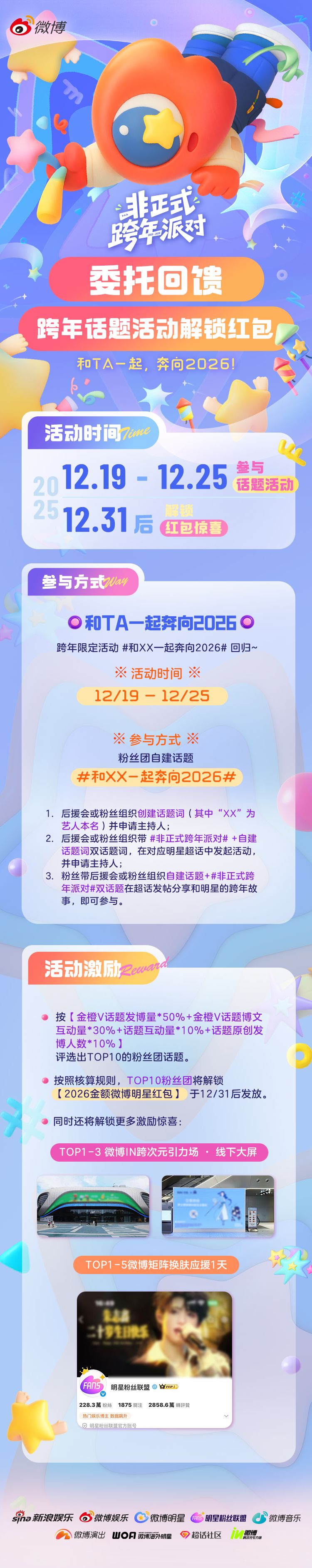 📣粉丝特派员们集合!事务所的多项委托火热推进中,非正式跨年派对 之「委托回馈」也即将开启🎉跨年限定话题活动回归📮参与活动解锁惊喜红包🎁和TA一起奔向2026~📅活动时间:🔸12.19 ~12.25 参与话题活动🔸12.31 🔓解锁红包惊喜📮参与方式:🔹后援会或粉丝组织创建话题 和XX一起奔向2026 (其中“XX”为艺人本名)并申请主持人;🔹后援会或粉丝组织带 【非正式跨年派对 +自建话题】 双话题词,在对应明星超话中发起活动,并申请主持人;🔹粉丝带【粉丝组织的 自建话题+ 非正式跨年派对 】双话题在超话发帖分享和明星的跨年故事即可参与~🎁活动激励:按【金橙V话题发博量*50%+金橙V话题博文互动量*30%+话题互动量*10%+话题原创发博人数*10%】的核算规则评选出TOP10的粉丝团话题🔓解锁【2026金额微博明星红包】,🧧于12.31后发放~还有线上线下曝光资源惊喜解锁✨一起开启「委托回馈」打开跨年惊喜红包🧧一起奔向2026!更多活动详情请戳下图👇