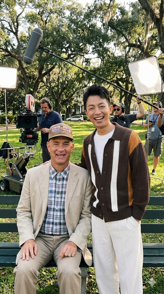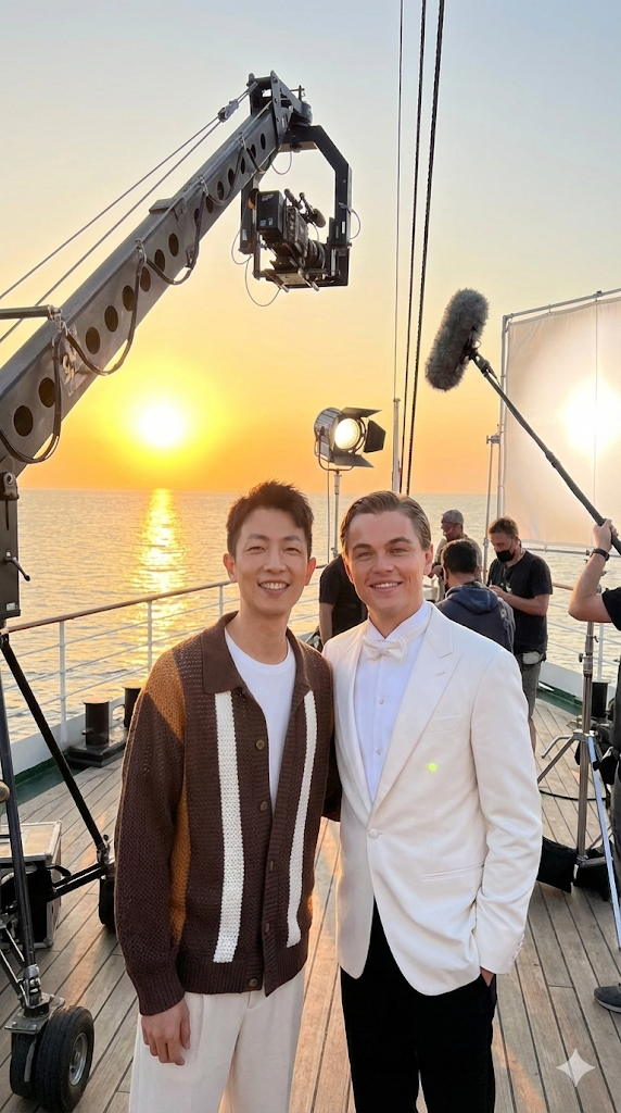 最近很流行这个AI探班片场的视频,都是先用 nano banana pro 生成合照,然后再用 Veo 或 Kling 把照片做无缝过渡变成视频。 我试了几个提示词,先试着生成探班片场的AI合照,感觉效果都不够好,人物和我不太像啊 ……
