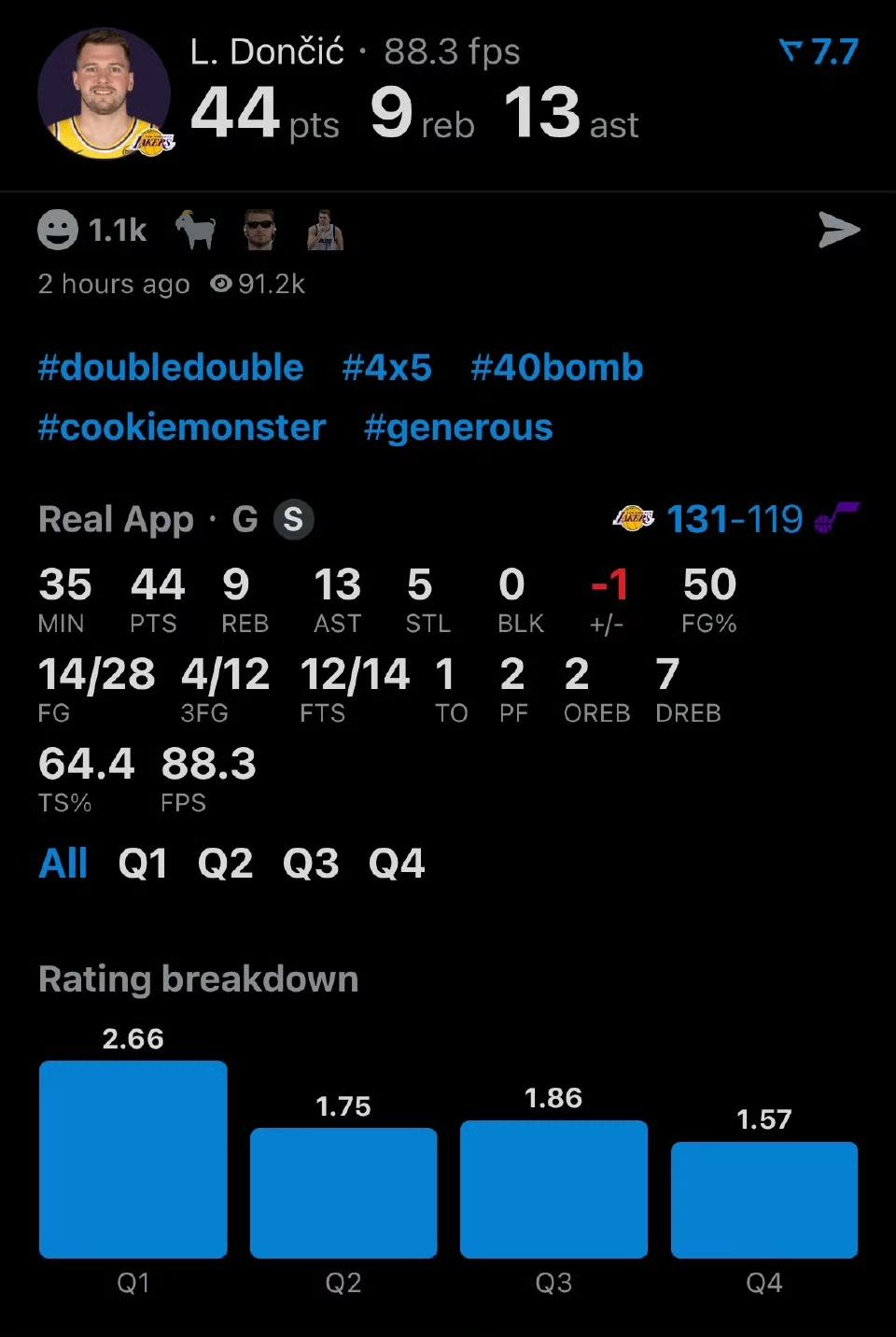 东契奇在湖人享有无限开火权! 本场28次投篮14中,三分球12中4,得到44分13次助攻。 也就是詹姆斯老了,很羡慕他吧。 湖人第一核心就是东契奇了,等里夫斯回来,看谁是第二核心。[思考]