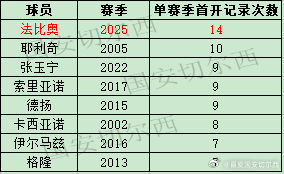 【赛季数据总结-联赛首开纪录(球员篇)】 球队2025赛季在联赛共27场比赛收获进球,共有11名球员为球队首开纪录。其中法比奥共14次为球队首开纪录,单赛季首开纪录次数超越2005赛季耶利奇的10次,创造新高。在球队历史位列第一位。现在阵中张玉宁和索里亚诺、德扬同以9次并列第三位。 法比奥加盟国安后在联赛已经21次为球队首开纪录,超越陶伟,在历史排行榜中位列第三位。两位现在阵中的球员张玉宁和张稀哲排在前两位,张玉宁27次,张稀哲29次。(注:本数据的首开纪录是指单场比赛为球队攻入第一球的球员)