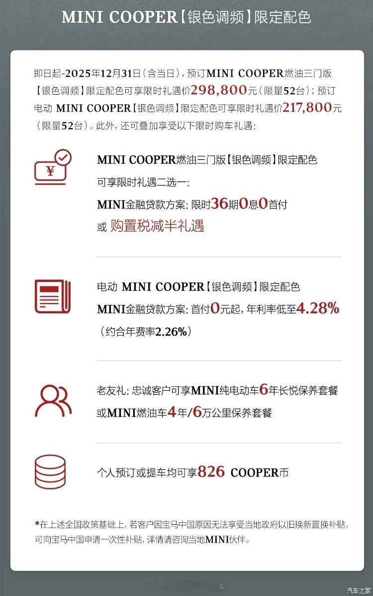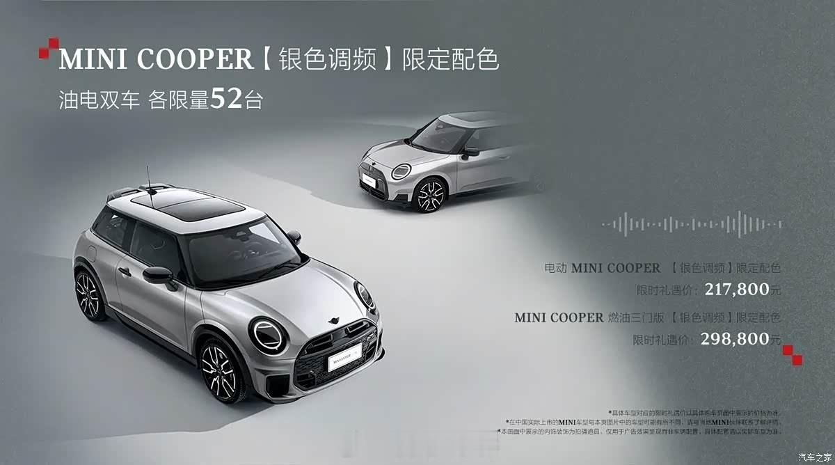 MINICOOPER银色调频限定版正式上市 据悉,12月19日,MINI COOPER银色调频限定版正式上市,其中电动MINI COOPER限时礼遇价21.78万起、MINI COOPER燃油三门版限时礼遇价28.88万起。两款车型均限量52台,12月31日前购车可享36期0息0首付或购置税减半、4年/6万公里保养套餐(燃油版);首付0元起年利率4.28%、6年长悦保养套餐(电动版);以及826 COOPER币等。(汽车之家)