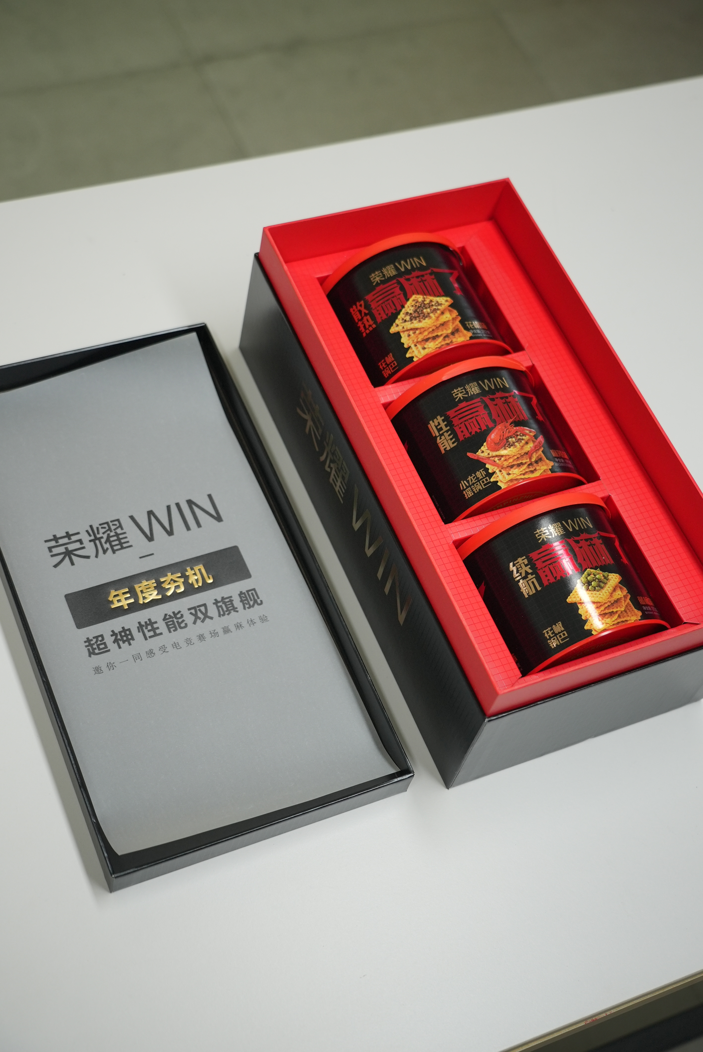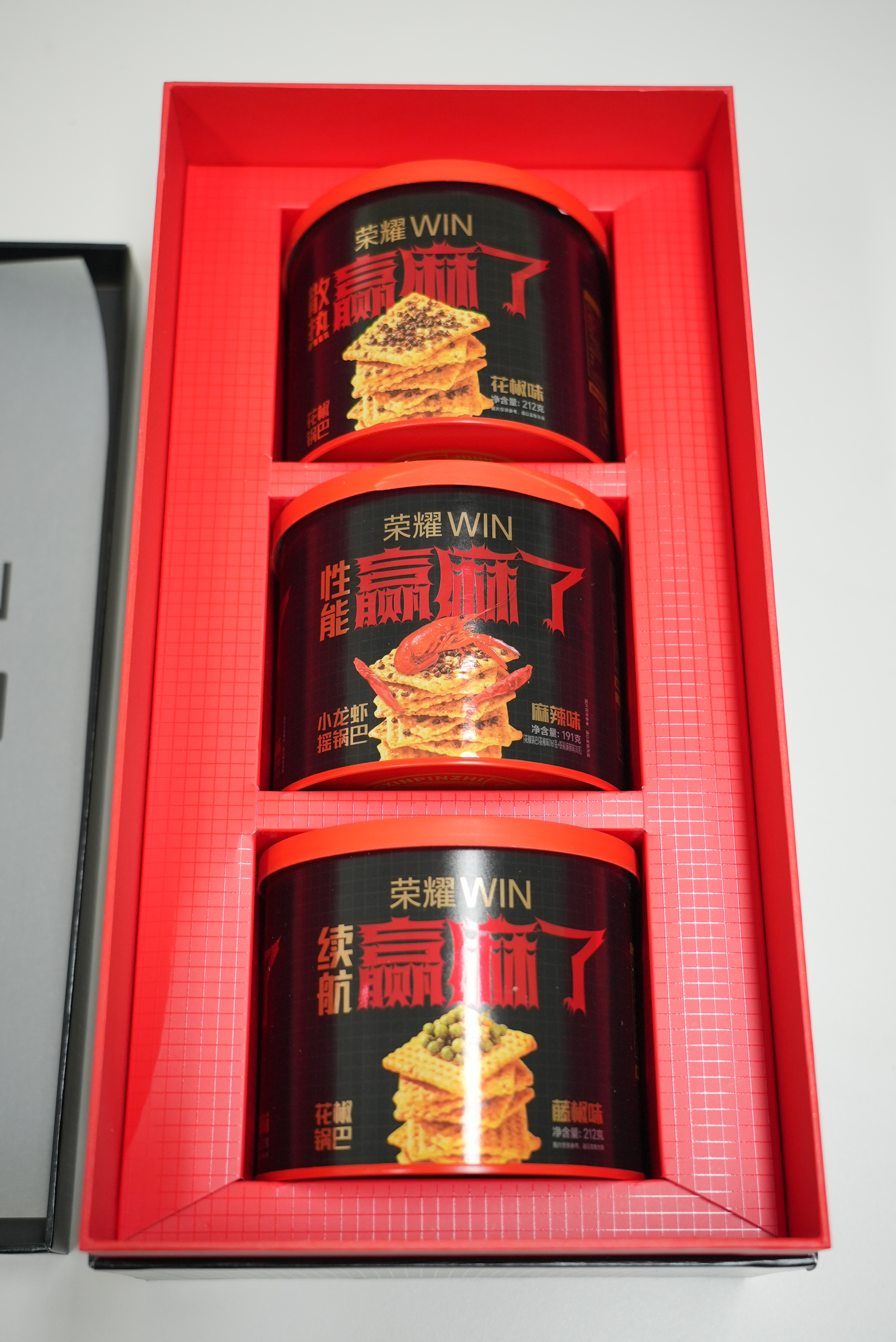 荣耀 WIN 系列的邀请函是三罐锅巴,主打一个「赢麻了」 ~ 分别是散热赢麻了(花椒锅巴花椒味)、性能赢麻了(小龙虾摇锅巴麻辣味)、续航赢麻了(花椒锅巴藤椒味)。你还别说,这个锅巴味道真挺不错,吃完这三罐儿,还想复购。