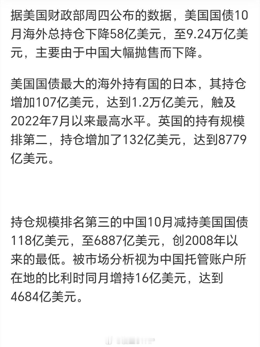 中国10月减持美国国债118亿美元中国10月减持美国国债118亿美元,持有量降至6887亿美元,创出2008年以来的最低。