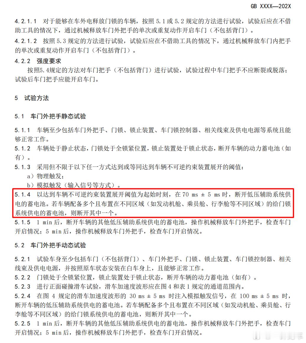 划个重点:碰撞(爆气囊)或者电池热失控后,必须能「通过机械释放车外门把手开启车门」,因此纯电控门把手明确被禁止了,无论是不是隐藏式;同时,门把手任意状态时,必须有相对车身表面的手部操作空间,意味着全隐藏门把手也被禁了,假装全隐藏的恐怕也不行。明确禁止全隐藏式门把手静态试验方法要求,先断开动力电池,然后碰撞达到阈值后在70毫秒内就要断开低压蓄电池,最后检查车门能不能打开。这个要求看着很有针对性,因为如果没能在70毫秒内使车门解锁,又没有备用的冗余电源,那么就必然无法达到要求了。持续推动行业进步