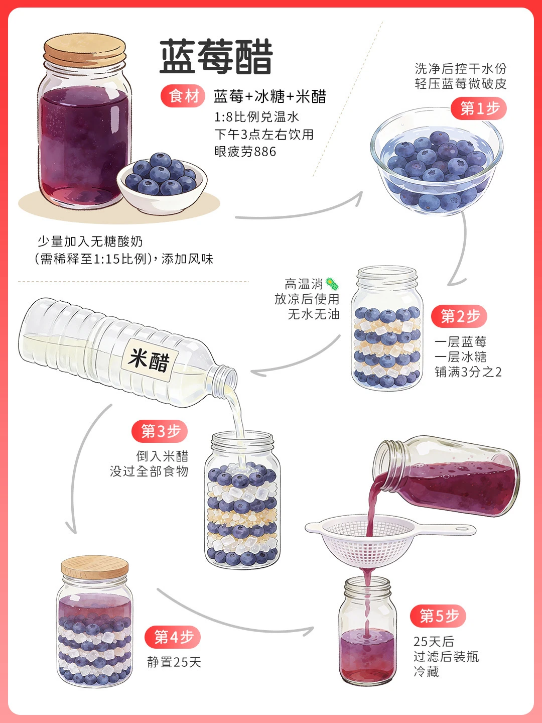 果醋需稀释饮用,避免刺激胃黏膜;胃酸过多、孕妈需谨慎,开封后冷藏,1个月内饮完~