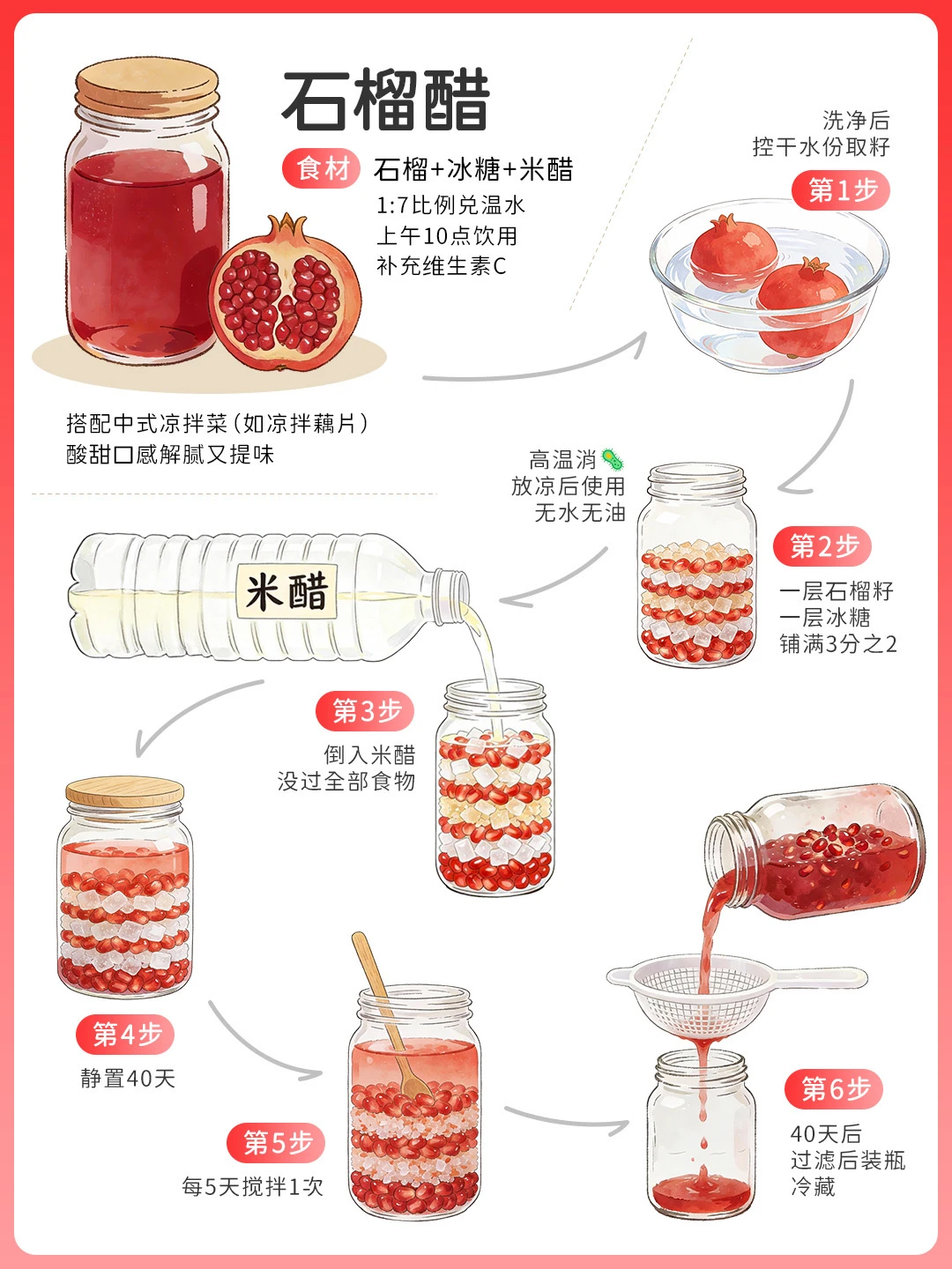 2个石榴取籽400g+180g冰糖+500ml米醋,密封静置40天(每5天搅拌)。多酚与维c双重加持,上午10点1:7兑温饮,科学k氧化,搭冬至凉拌菜超解腻~