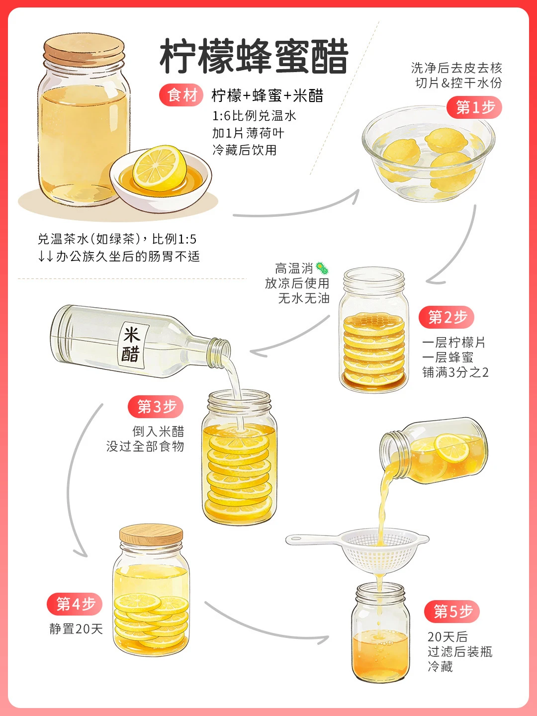3个柠檬切片去籽+150g蜂蜜+300ml米醋,交替铺罐静置20天。维c含量丰富,1:6兑温热水加生姜,科学缓和冬日干燥,入口暖融融~