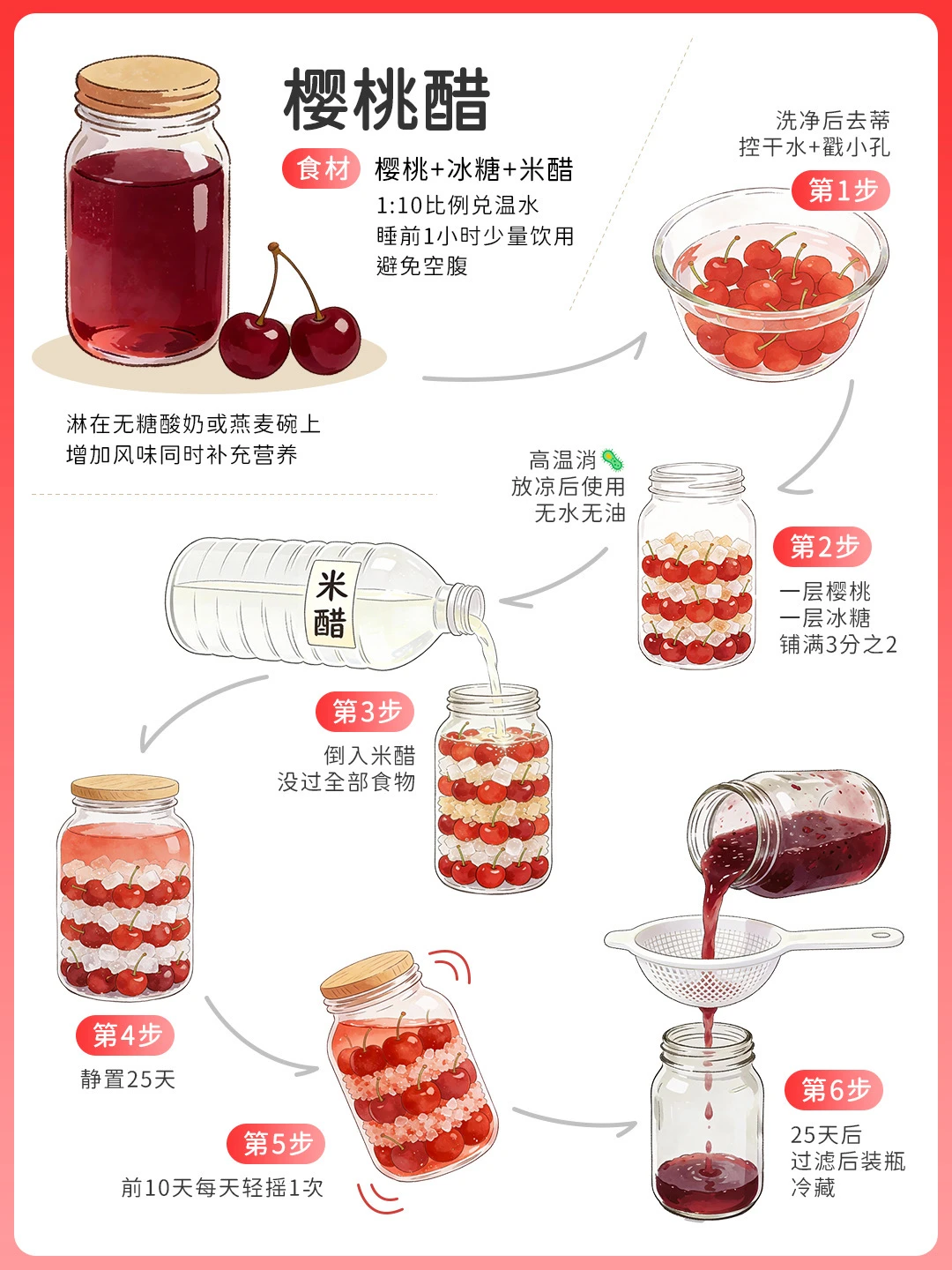 400g樱桃戳孔+150g黄冰糖+400ml白米醋,密封前10天每日轻摇,25天滤出。花青素与铁元素协同,冬至后睡前1:10兑温饮,科学补充营养,暖身润心助安睡~