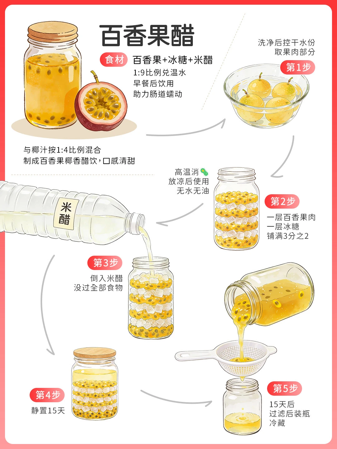 10个百香果取果肉+200g冰糖+400ml白米醋,密封15天。膳食纤维丰富,早餐后1:9兑温饮,科学助力肠道蠕动,搭热燕麦更爽口~