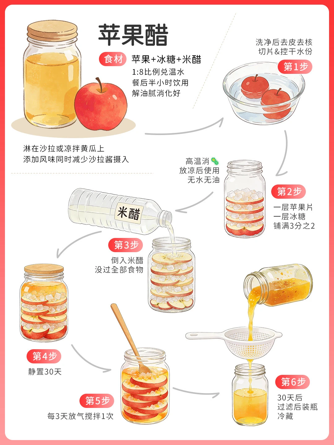 500g苹果+200g冰糖+500ml米醋,分层铺罐静置30天,每3天放气搅拌。含苹果酸和果胶,家宴后1:8兑温热水慢酌,科学辅助延缓糖分吸收,舒胃又暖身~