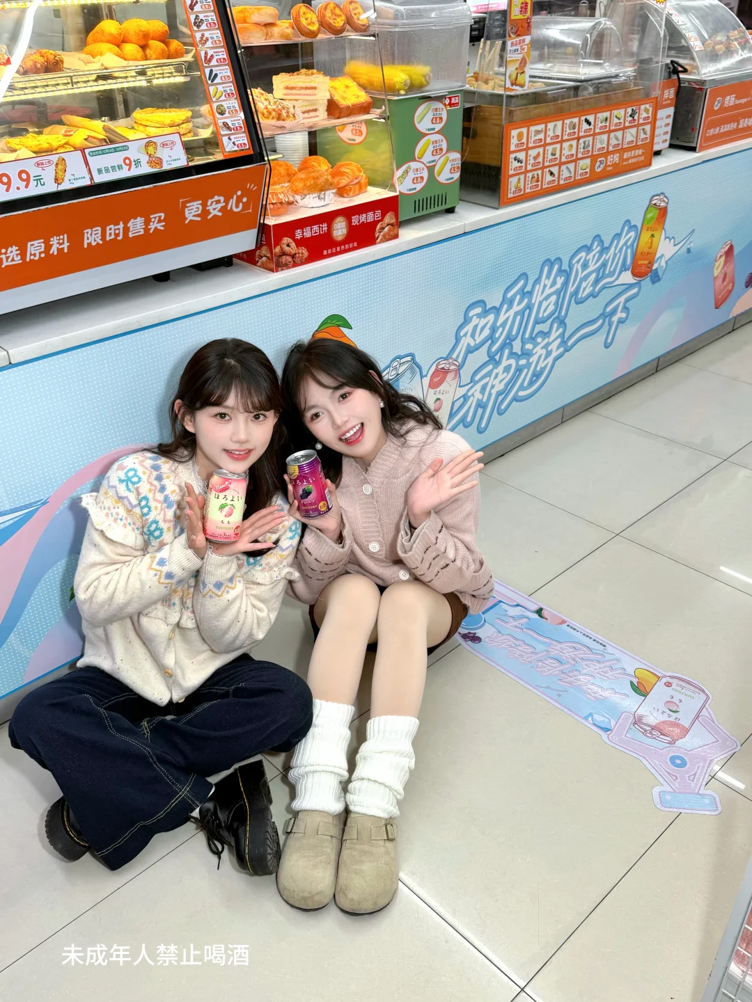 - 收银台旁:并排蹲坐拿饮料,镜头俯拍显腿长