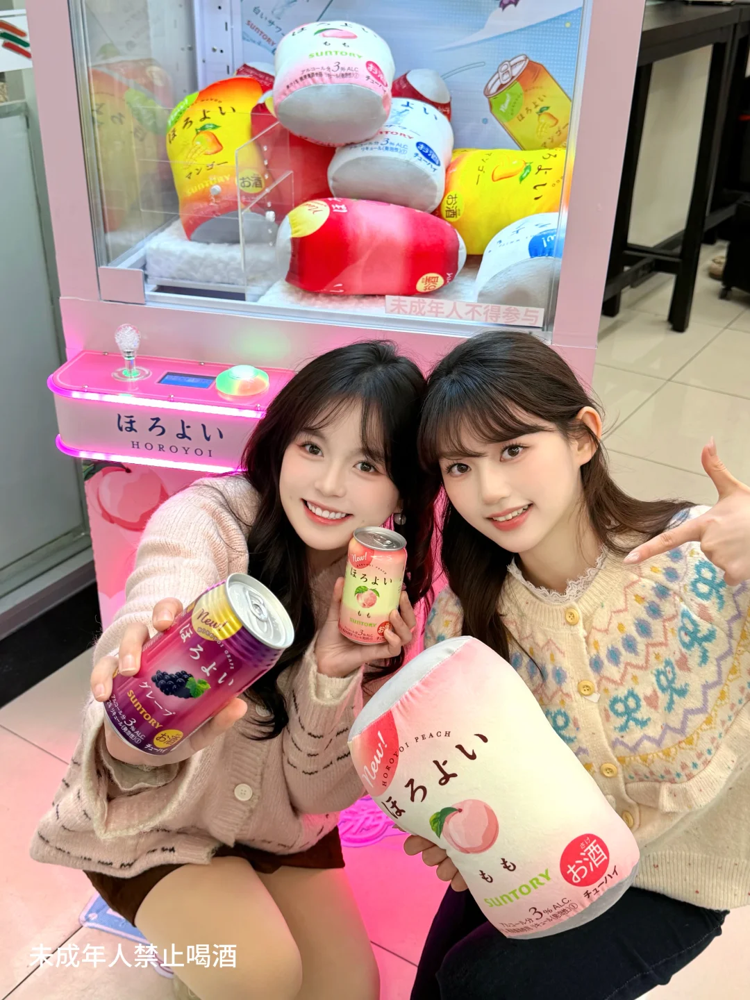 -娃娃机前:一人拿饮料放胸前,一人递向镜头