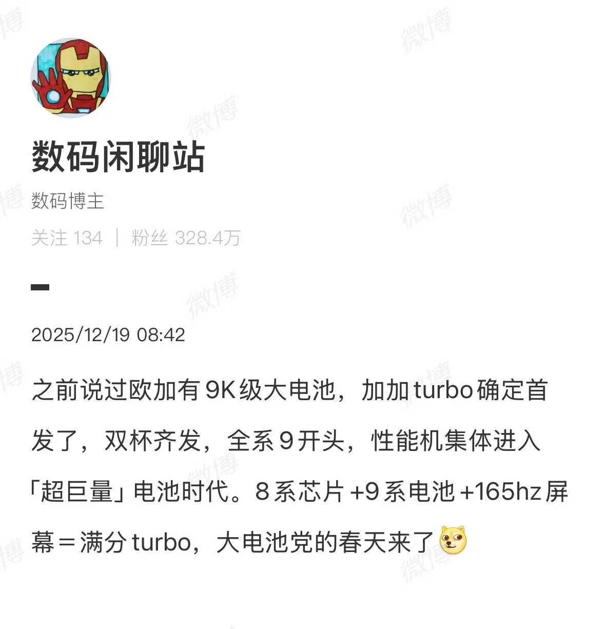 惊了,一加Turbo新系列这波直接王炸啊,曝欧加9系大电池由一加turbo首发据闲聊站爆料,容量超过9000mAh,直奔万字头超巨量电池,并且还双杯全系标配。敢情中端机直接把充电宝踢出局,属实把续航卷到天花板了,这波妥妥续航第一梯队选手了吧,手机电池正式迈入超巨量时代,强得可怕