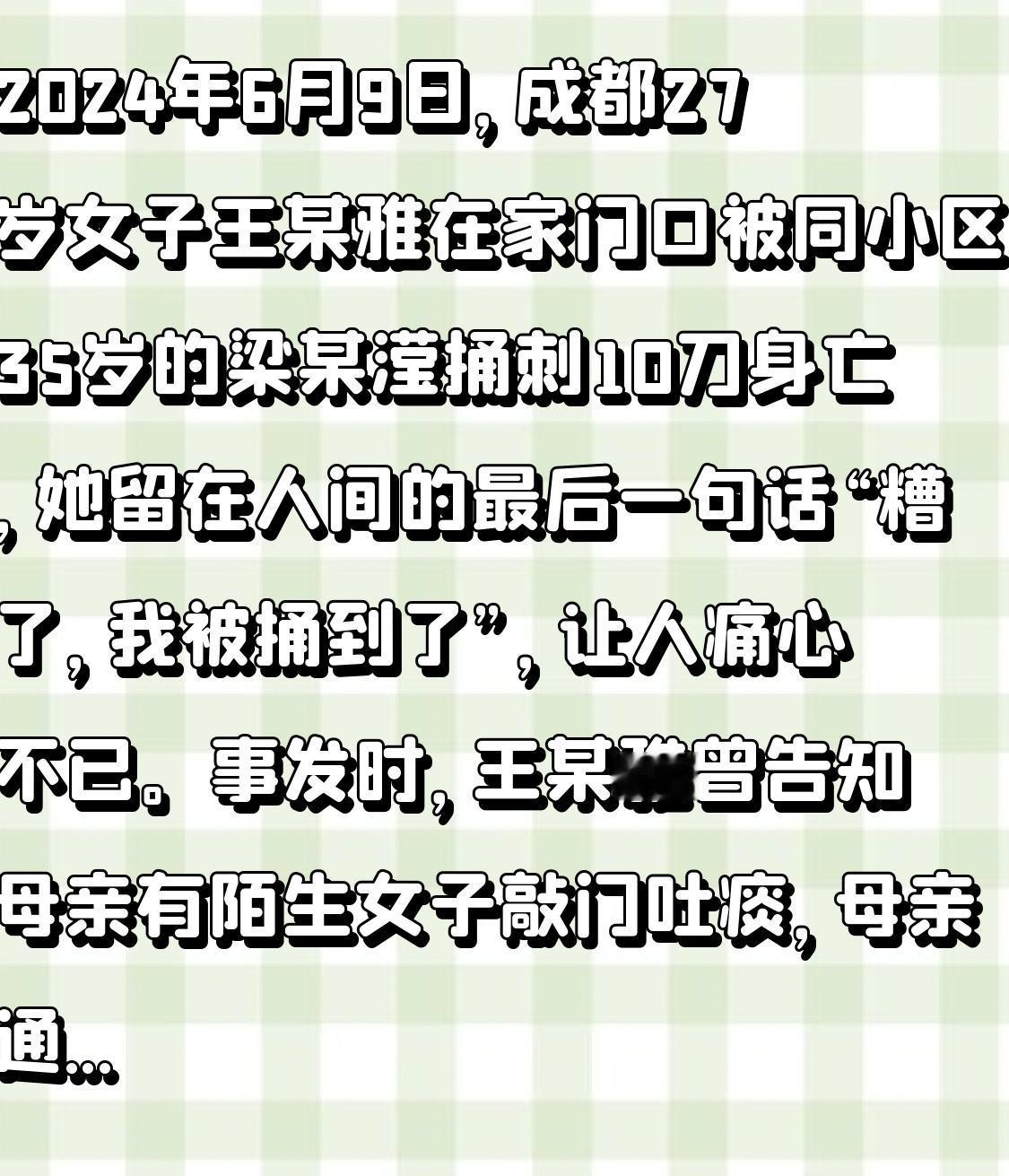 2024年6月9日,成都27岁女子王某雅在家门口被同小区35岁的梁某滢捅刺10刀身亡,她留在人间的最后一句话“糟了,我被捅到了”,让人痛心不已。事发时,王某雅曾告知母亲有陌生女子敲门吐痰,母亲通知物业,保安到场后她才开门。 2025年11月20日该案一审开庭,梁某滢当庭拒绝辩护人辩护致延期审理。12月16日继续审理,庭审中检方出示证据,各方充分发表意见,附带民事诉讼原告人还撤回了诉讼。王某雅母亲只为进法庭质问凶手,希望其血债血偿。这一悲剧让人感叹生命无常,也期待法律能给出公正判决。