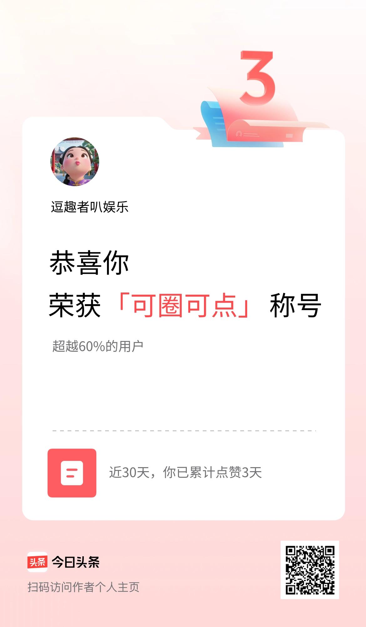 我在头条30天内点赞打卡3天,获得“可圈可点”称号努力深耕
