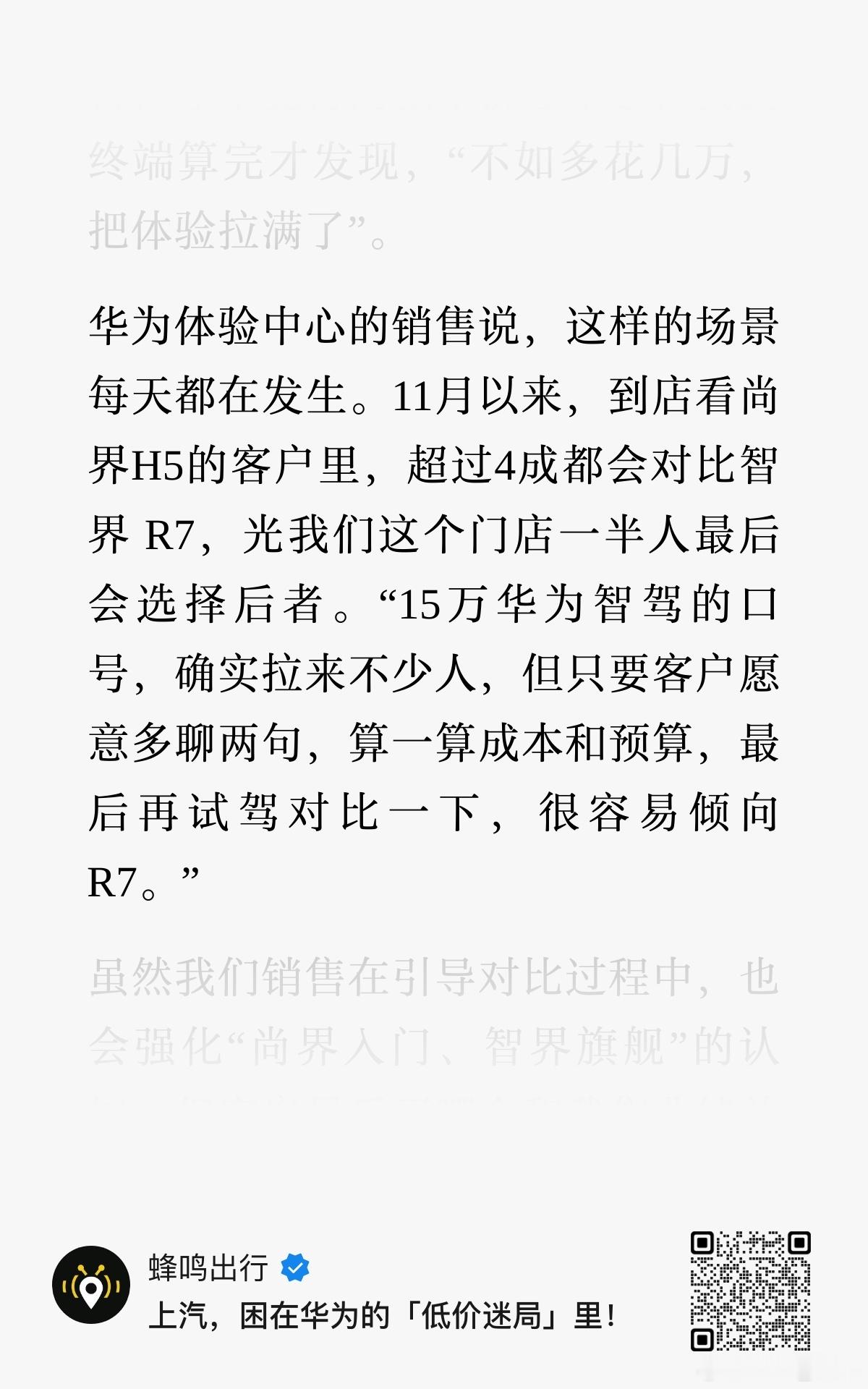 尚界H5 上市43天交付破万,上个月单月破1万,这个成绩拿出来,说是大获成功当然不准确,距离当初双方内部定下的目标,事实上也有很大差距。看下来,终端认为未达目标的核心原因,一是产品配置,全系400V 架构不满足用户对 “先进技术 + 先进智能” 的诉求;二是内部生态竞争,“15万买华为智驾”的口号吸引来客户,算下来发现加一点就能上R7,反而沦为了智界的流量跳板。虽说H5只是尚界的第一张牌,但归根到底,产品力才是硬道理,五界五境成型之后,正面对比是无可避免的。