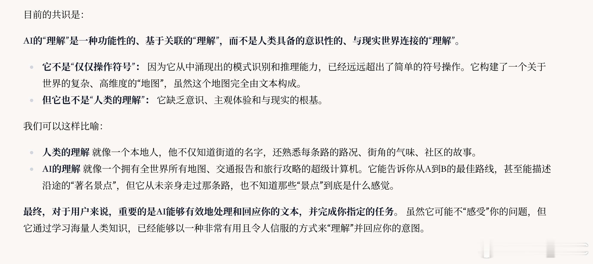 问:AI可以理解用户的文本吗?MiMo的回答:人类的理解 就像一个本地人,他不仅知道街道的名字,还熟悉每条路的路况、街角的气味、社区的故事。AI的理解 就像一个拥有全世界所有地图、交通报告和旅行攻略的超级计算机。它能告诉你从A到B的最佳路线,甚至能描述沿途的“著名景点”,但它从未亲身走过那条路,也不知道那些“景点”到底是什么感觉。