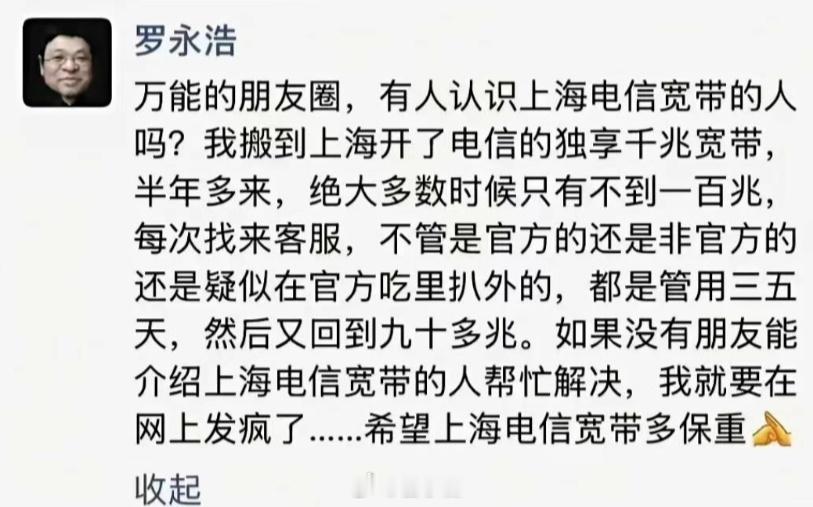 支持老罗整顿宽带缩水的行业乱象。我们公司签的是移动的千兆宽带,日常使用连 700 都不到,而且网络波动很频繁,间歇性断网。找师傅上门,操作一番就恢复了,过几天问题依旧。罗永浩痛批电信宽带缩水