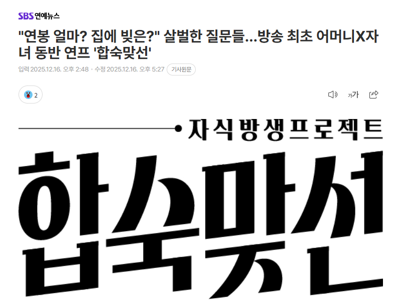 【韩国推出母亲·子女共同参与的恋综《合宿相亲》】海外新鲜事热点现场 韩国首个母亲与子女同住、亲自旁观恋爱的全新概念恋爱节目即将登场。SBS将于2026年新年推出的新节目《子女放生计划-合宿相亲》(以下简称《合宿相亲》)中,10名渴望结婚的单身男女和10名希望子女结婚的母亲,将在同一空间进行为期5天6夜的合宿,亲眼目睹自己子女的恋爱过程。这是一档超现实主义的真实恋爱综艺。该节目记录了母亲与子女为了“结婚”这一共同目标,携手共度的5天6夜。当亲眼目睹自己的子女被拒绝时,母亲会偷偷抹泪,子女则对母亲感到愧疚。这段合宿时光里,欢笑与泪水交织。作为恋爱综艺,心动感和多巴胺爆棚的瞬间也是必不可少的看点。尤其值得关注的是,在欢声笑语的气氛中,母亲们之间也会展开激烈的神经战,准婆婆和准丈母娘之间关于结婚条件的甜蜜又可怕的较量也令人不寒而栗。为了帮自己子女争取到心仪的对象而奋力拼搏的母亲,以及为了撮合自己看中的其他对象而暗中努力的母亲,为了子女,母亲们展开了一场不顾水火、激烈无比的眼色战和心理战。此外,据报道,为了自己的孩子,准婆婆和准丈母娘们向对方子女抛出的诸如“年薪多少?”“家里没有负债吧?”等甜蜜又可怕的结婚条件,也让子女们心惊胆战。在爱情面前,“我的宝贝孩子”可能变成孝子孝女,也可能爆发出“那么喜欢的话,妈妈你去结婚好了!”“妈妈,结婚的是我!”这样的话,展现了母子/母女间的冲突。坚持“外貌要符合我的审美才会心动”的子女,与认为“外貌又不能当饭吃”的母亲之间,观念差距逐渐拉大,导致子女喜欢的人和母亲中意的人选出现偏差,最终爆发的冲突也被真实呈现。“爱情 VS 条件”,适婚年龄子女们面临的混乱罗曼史也将继续上演。抱着一定要找到结婚对象的决心聚集在一起的男女们,跨越年龄、职业、学历、经济能力等条件,甚至会探讨收入管理的主导权、生育时机等问题。在这个过程中产生的现实意见分歧,让他们不得不重新审视对方,展开极其现实的“极写实主义”恋爱。超现实恋爱综艺《合宿相亲》将于2026年1月1日晚9点首播。