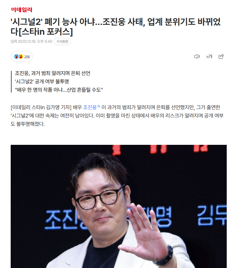 【韩媒:《信号2》废弃并非良策…赵震雄事件后,业界氛围也在变化】海外新鲜事热点现场 演员赵震雄因过往犯罪被曝光后宣布退出演艺圈,但他出演的《信号2》问题依然悬而未决。该剧已完成拍摄,但由于演员的风险被曝光,公开与否变得不明朗。近期电视剧业界最关注的是《信号》第二季是否能够播出。作为tvN20周年和《信号》10周年纪念而精心准备的项目,业界原本对这部作品寄予厚望,但因主演赵震雄过往犯罪被曝光而陷入困境。电视界通常在主演演员风险曝光时,会通过演员下车或剪辑的方式解决问题。但这次情况非常棘手。电视剧拍摄已经全部完成,后期制作也进展到了相当程度。赵震雄的戏份无法由其他演员替代重拍,如果进行剪辑则会影响剧情发展,可谓进退两难。然而,若因此废弃该剧,可能会给整个行业带来危机。数百亿韩元的制作费将化为泡影。即使Studio Dragon是韩国最大的制作公司,也难以承受这样的损失。业界相关人士担心《信号2》的危机会导致行业陷入低迷。虽然随着全球在线视频服务(OTT)平台进入韩国市场,韩国电视剧获得了海外关注,但同时也带来了制作成本飙升的副作用。制作成本上升意味着失败时的损失也会更大。这导致制作方更加谨慎,作品编排也随之减少。业界原本期待能够转变行业氛围的爆款作品出现,而《信号》这个有票房保证的IP制作第二季,被认为是能够给业界带来活力的作品。特别是《信号》作为时隔10年才制作新一季的特例,业界认为其具有重要的启示意义。电视剧制作公司相关人士A表示:"《信号》第二季的制作展示了优秀IP的必要性。如果能够确保好的IP,那么无论何时都能利用IP进行项目开发,本希望它能成为这样一个典范案例。"他接着说:"但因为演员风险,连确认这一结果的机会都可能消失,这令人惋惜。"虽然因为演员风险导致观众难以完全沉浸于剧中,但业界人士普遍认为,作品并非仅由一名演员创作,因此应该公开播出。电视剧制作公司相关人士B指出:"这是数百名工作人员的心血和数百亿韩元制作费完成的作品。如果因为一个人的风险就轻易废弃,整个行业都可能动摇。"随着这种共识的形成,尽管出演者存在风险但仍公开播出的案例也在增加。电影《胜负》、Netflix《末日愚者》在刘亚仁争议后相继公开播出,白钟元的《黑白厨师2》也在争议中播出。电视剧制作公司相关人士C表示:"出演者应该注意言行,制作公司也应该慎重选角,但不能因为一个人的风险就让作品消失。制作公司并非明知该演员有风险而选角,如果不能公开播出,比起事件当事人,代价是否过于残酷?"他接着说:"电视剧制作市场困难重重,每一部作品的成功与否都关系到整个行业,作品不是演员一个人的,所以希望演员为自己做错的事情负责,作品至少能够公开播出。"