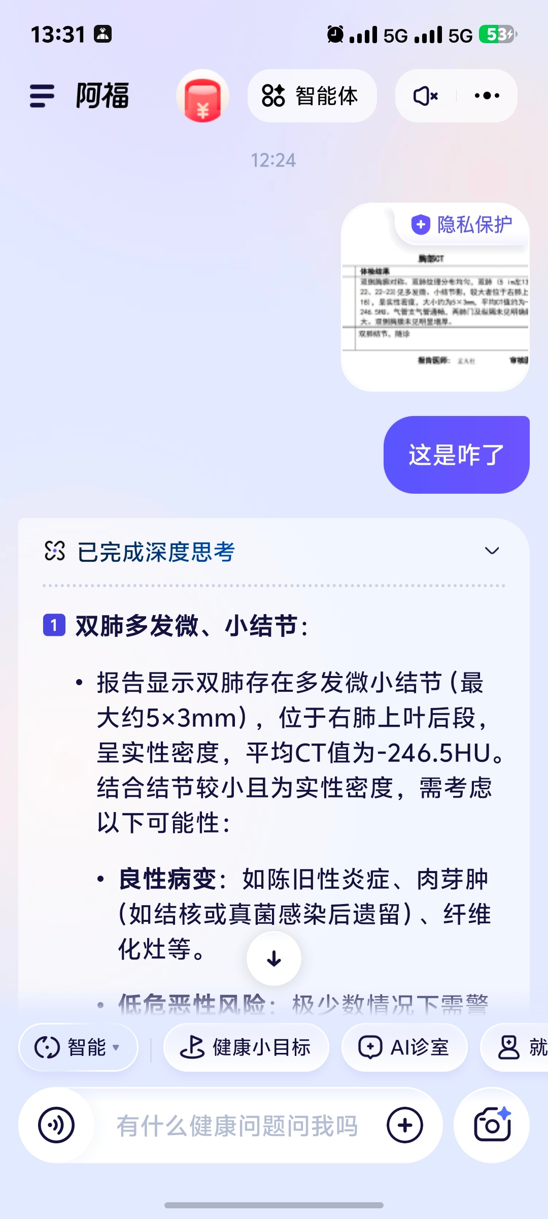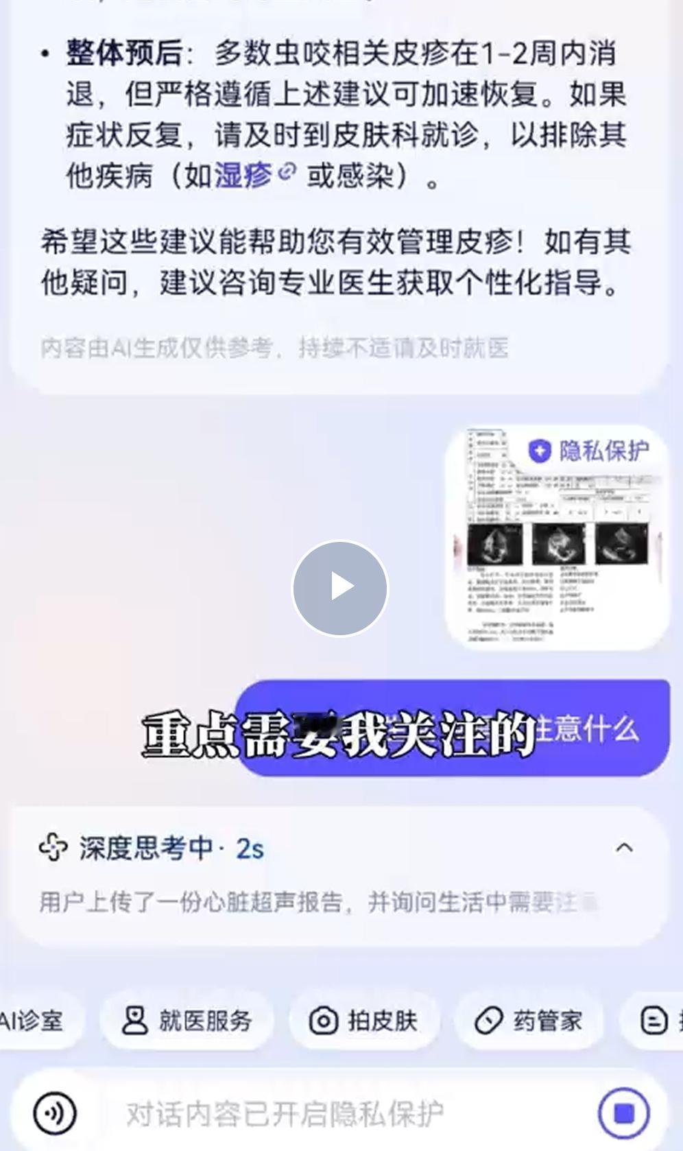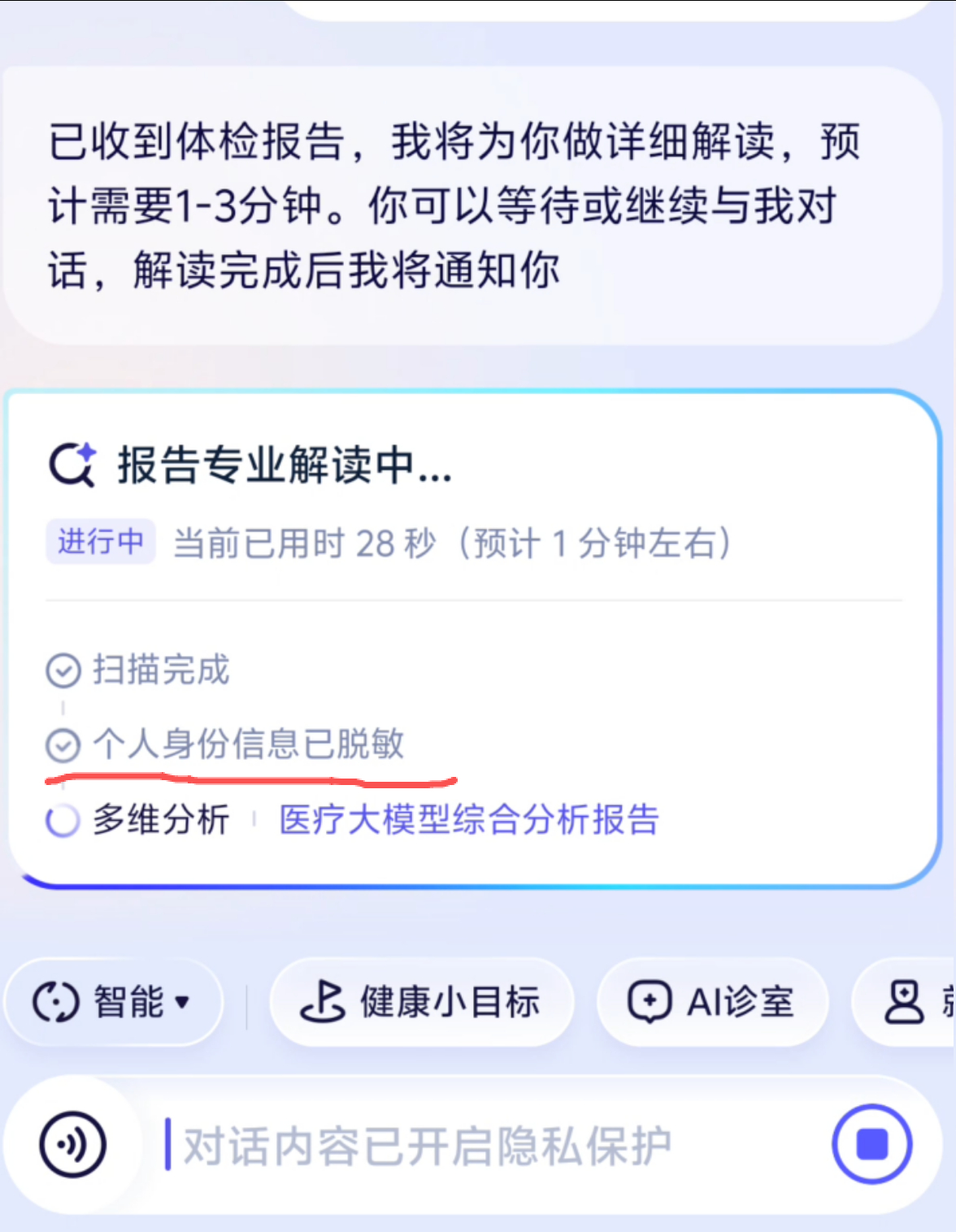 阿福三分钟看懂体检报告关于体检报告,俺的感觉是越专业的机构(医院)体检报告越不好解读,这时有个助手来帮忙解读蛮好的。如果用通用的AI来解读,主要是怕它搜一些网上乱七八糟的资料给污染了解读不正确,用这种专业的医学类AI就比较放心。而且哪里不明白还可以追问,制定配套的健康计划(运动打卡啥的),并监督你每天打卡,一整套下来健康+自律都有了。还有个小细节:给蚂蚁阿福发体检报告的时候,会先对个人信息进行脱敏处理( 图1 ),感觉挺不错的。AI医生请回答