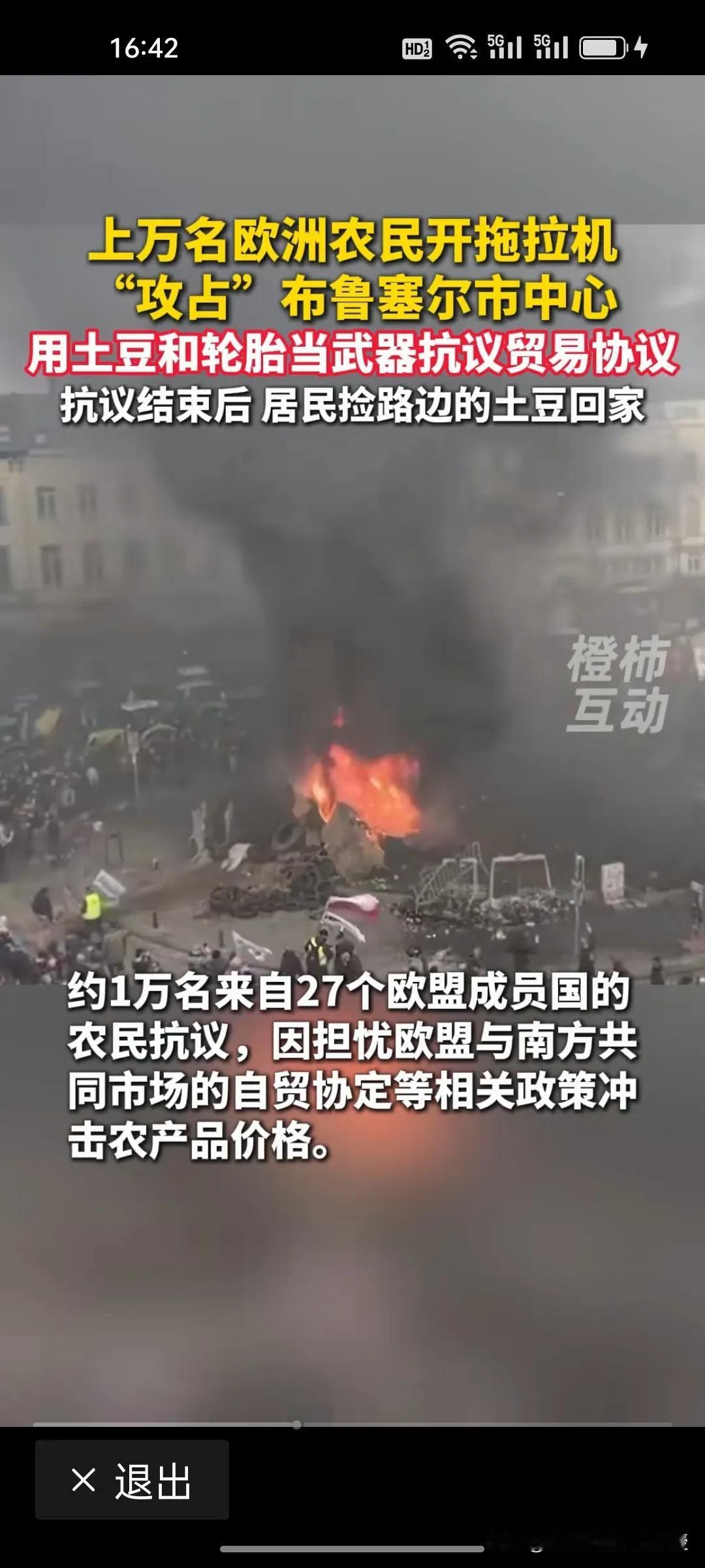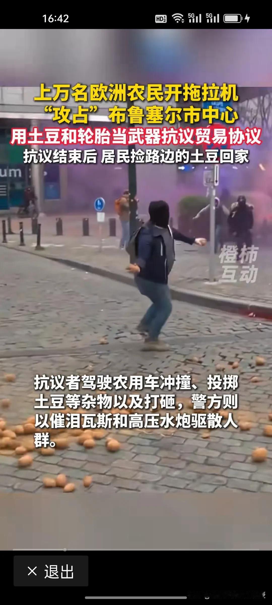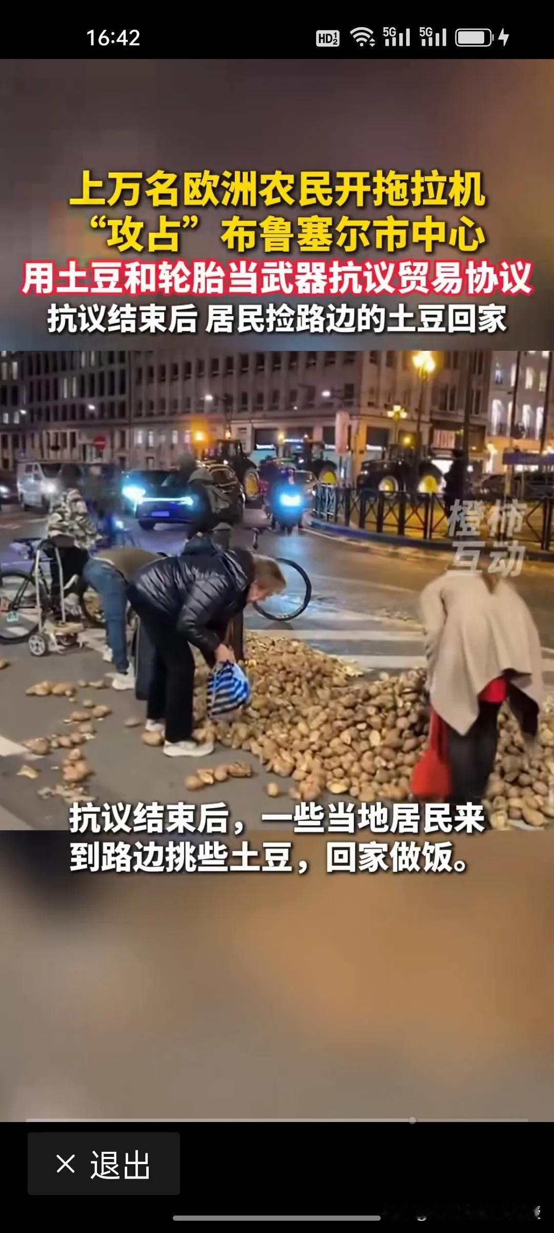 欧盟农民大哥是真豪迈!开着拖拉机闯进布鲁塞尔市中心维权,土豆一撒,既是抗议武器也是生活底气,这波操作太硬核! 今天,布鲁塞尔彻底乱了!上万欧盟农民开拖拉机攻占市中心,把土豆、轮胎当武器抗议自贸协定,和警方爆发了激烈冲突,现场一片狼藉,惨不忍睹。 农民担心国家政策冲击农产品价格,从而进行抗议维护自身权益。然而抗议结束了,土豆撒完了,另一幅画面出现了。当地居民竟然蹲路边悄悄挑捡完好的土豆回家做饭,土豆可是欧洲人饭桌上必不可少的主食。欧洲居民真实在啊!主打就是不浪费。一边是维权的怒火,一边是生活的烟火,这反差太大了![捂脸]